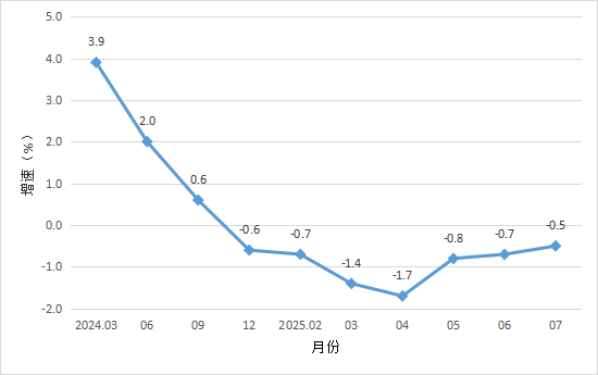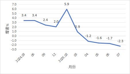 2024年3月以來開平市規模以上工業增加值增速 二、投資 1-7月,全市固定資產完成投資同比下降26.6%。分經濟類型看,國有投資下降8.7%;港澳臺和外商投資增長13.8%;民間投資下降25.8%。 三、消費市場 1-7月,我市完成社會消費品零售總額97.25億元,同比下降0.5%。 圖2