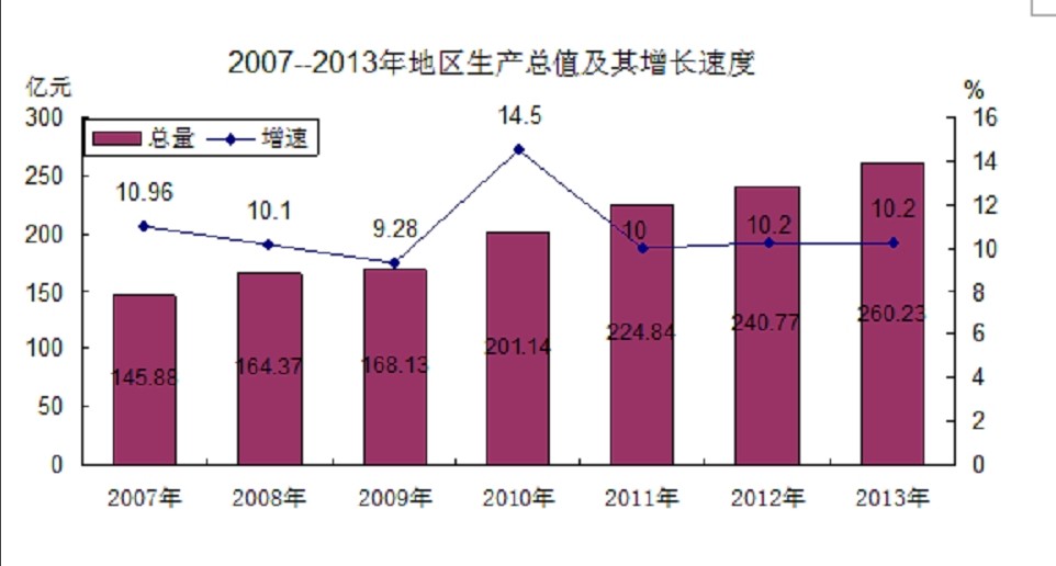 初步核算,2013年全市實現地區生產總值260.23億元(當年價),比上年增長10.2%。其中:第一產業 增加值25.97億元,增長1.9%;第二產業增加值131.33億元,增長15.2%;第三產業增加值102.93億元,增長5.2%。第一、二、三產業增加值的比重為9.98 :50.47 : 39.55。人均生產總值37039元。