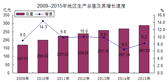 2015年,全市深入貫徹落實上級黨委、政府的各項決策部署,沉著應對各種困難和挑戰,以“奮發圖強、改革攻堅、提質發展”為工作主線,主動適應經濟發展新常態,團結和帶領廣大干部群眾出實招、干實事、求實效,推動經濟社會持續、健康、穩步發展,全市經濟社會發展在“十二五”收官之年取得新的成就。 一、綜合 初步核算,2015年全市實現地區生產總值287.92億元(當年價),比上年增長8.2%。其中:第一產業增加值27.72億元,增長3.2%;第二產業增加值141.58億元,增長8.5%;第三產業增加值118.62億元,增長8.9%。第一、二、三產業增加值的比重為9.63:49.18:41.19。人均地區生產總值4.07萬元。 圖1: 二、農業 全年實現農業總產值50.92億元,比上年增長3.7%。全年糧食作物播種面積67.83萬畝,比上年下降0.10%。其中:水稻種植面積61.86萬畝,比上年增長2.50%。 全年糧食總產量22.56萬噸,比上年增長0.15%,其中:稻谷20.79萬噸,比上年下降0.09%。 圖2: 全市更新造林面積4.68萬畝,比上年增長14.71%;木材砍伐17.75萬立方米,比上年下降2.81%。 畜牧業肉類總產量7.52萬噸,比上年增長3.72%;全年生豬出欄量60萬頭,比上年增長1.68%;家禽出欄量2373.06萬只,比上年增長6.39%;禽蛋全年總產量1.53萬噸,比上年增長24.39%;水產品產量5.18萬噸,比上年增長3.6%。 三、工業和建筑業 2015年,全市規模以上工業企業257家,規模以上工業增加值比上年增長9.1%,工業總產值比上年增長15.37%。工業總產值中,按輕重工分:輕工業增長17.38%,重工業增長13.40%;按企業經濟類型分:外商及港澳臺商投資企業增長13.20%;股份制企業增長17.10%;其他經濟類型增長28.08%。 圖3: 全年規模以上工業企業銷售產值比上年增長11.46%,產品銷售率90.66%,主營業務收入比上年增長9.94%,利潤總額比上年增長54.81%。 全年具有資質等級的總承包和專業承包建筑企業完成總產值125.37億元,比上年增長28.69%。工程結算收入126.24億元,比上年增長94.07%。實現利潤總額5.1億元,比上年增長48.26%。 四、固定資產投資 全年固定資產完成投資總額209.11億元,比上年增長21.16%。其中:房地產完成投資27.86億元,比上年下降6.27%。固定資產投資中,第一產業完成投資2.3億元,比上年下降11.53 %;第二產業完成投資103.93億元,比上年增長35.38%;第三產業完成投資102.88億元,比上年增長10.35%。民資投資穩定增長,全年民資直接投資116.84億元,比上年增長51.03%。 全年商品房施工面積382.90萬平方米,比上年增長24.3%;竣工面積28.17萬平方米,比上年下降37.83%;商品房銷售面積80.22萬平方米,比上年增長56.61%;商品房銷售額34.87億元,比上年增長36.46%。 五、交通運輸和郵電業 全年社會客運量2761萬人,比上年下降0.62%;客運周轉量99811萬人公里,比上年增長2.74%;港口貨物吞吐量985.19萬噸,比上年下降6.44%。 年末市內公路通車里程182.9公里。汽車保有量7.80萬輛,比上年增長15.90%。摩托車保有量21.91萬輛,比上年增長6.57%。公共汽車擁有量0.02萬輛。 年末固定電話用戶16.8萬戶,移動電話用戶79.48萬戶,國際互聯網用戶15.75萬戶,互聯網用戶普及率78.90%。 六、國內貿易 全年社會消費品零售總額157.23億元,比上年增長11.00%。其中:城市消費品零售額111.75億元,比上年增長12.84%;農村消費品零售額45.48億元,比上年增長6.72%。 按行業分,批發零售貿易業實現零售額139.58億元,比上年增長11.57%;住宿和餐飲業實現零售額17.65億元,比上年增長6.68%。其中:限額以上貿易企業實現零售額37.75億元,比上年增長2.43%。 圖4: 七、對外經濟貿易和旅游業 全年海關進出口總值149.1億元,比上年下降8.6%。外貿出口總值124.3億元,比上年下降5.2%。進口總值24.8億元,比上年下降22.7%。實現對外貿易順差99.5億元。 全年實際利用外商直接投資0.55億美元,比上年下降8.99%。合同利用外資0.2億美元,比上年下降80.02%。新簽利用外資合同13宗,比上年下降18.75%,其中:外商直接投資13宗,比上年下降18.75%。外向型企業491家,其中:三資企業411家,來料加工企業80家。 全年旅游業共接待國內外游客573.07萬人次,比上年增長5.59%,其中:國內旅游者491.54萬人次,比上年增長6.30%;國際旅游者81.53萬人次,比上年增長1.50%;實現旅游總收入52.09億元,增長18.01%。全市擁有星級酒店4家,其中:五星級酒店1家,三星級2家,二星級1家。旅游飯店出租率77%。 八、財政金融 全年地方公共財政預算收入21.54億元,比上年增長8.28%;地方公共財政預算支出33.64億元,比上年增長21.09%。 年末金融機構存款余額479.85億元,比上年增長7.51 %。其中:城鄉居民儲蓄存款余額348.69億元,比上年下降0.43%。各項貸款余額225.12億元,比上年增長15.93%。僑匯收入0.50 億美元,比上年下降1.57 %。 九、科學技術和教育 全年科技事業獲得國家級1個、省級三等獎1個、江門市級二等獎5個、三等獎5個的獎勵。專利申請量2366件,專利授權量1342件。高新技術企業31家,其中:國家級27家、地市級4家。民營科技企業55家,其中:省級41家、地市級14家。全市擁有各類專業技術人員2.70萬人。 年末全市有中小學89所,其中完(高、職)中11所,初中19所,小學56所,九年一貫制學校3所,全市在校生共126797人,其中小學生53694人,初中生26244人,高中階段在校生20753人。特殊學校1所,在校生127人。電視大學1所,在校本科生340人,大專學生1181人。業余體校1所。幼兒園82所,在園兒童25979人。小學適齡兒童入學率100%,小學畢業生入學率100%,非正常流動率為0%;15周歲人口初等教育完成率100%,
