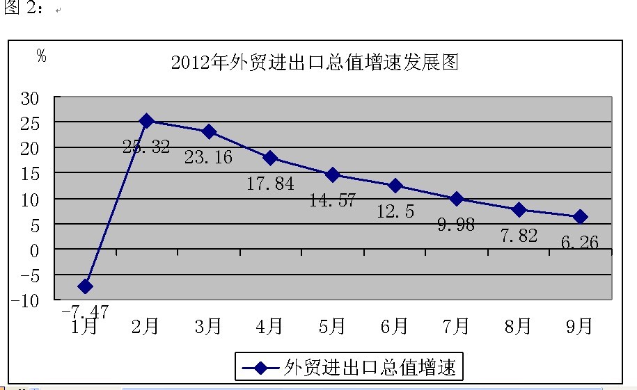 進出口方面。從年初開始,我市的進出口總值增幅就一直走下坡路,至9月份止,我市實現進出口總值16.08億美元,同比增長6.26%,比第二季度回落6.24個百分點、比第一季度回落16.9個百分點。見下圖2: