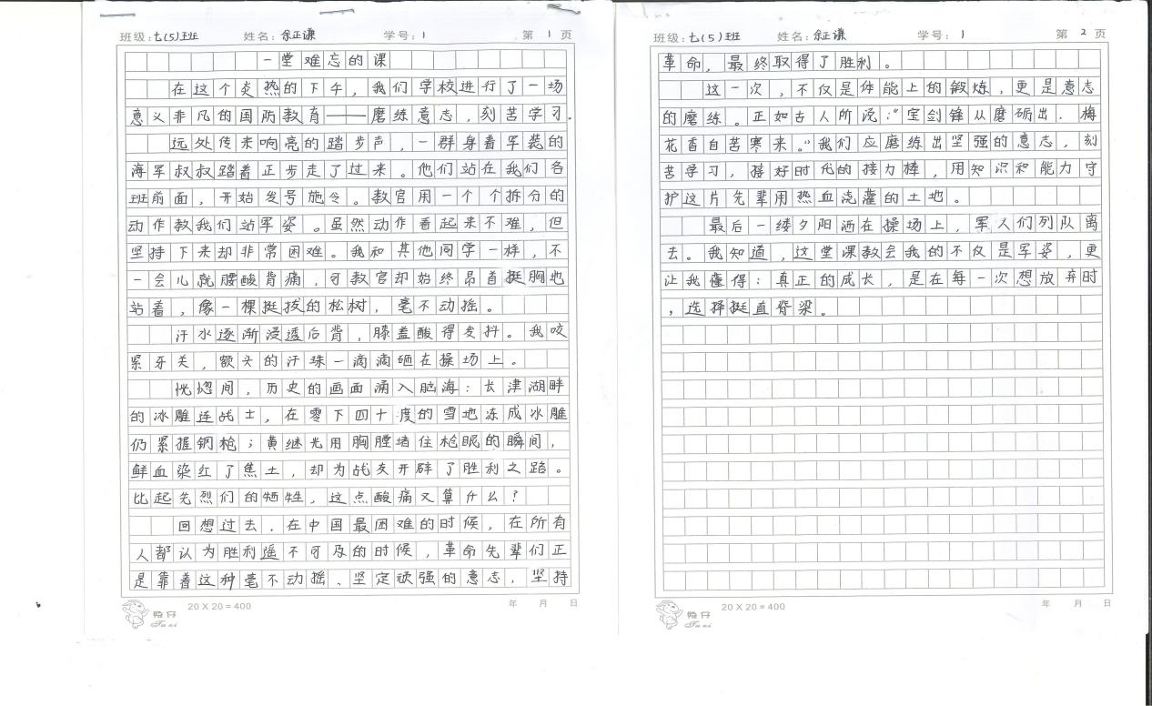 軍訓結束后,學生們將此次經歷轉化為筆下的動人文字。一篇篇飽含真情實感的作文,生動地描繪了軍訓的艱辛與收獲,表達了對軍人的敬佩以及自身在活動中的成長與感悟。