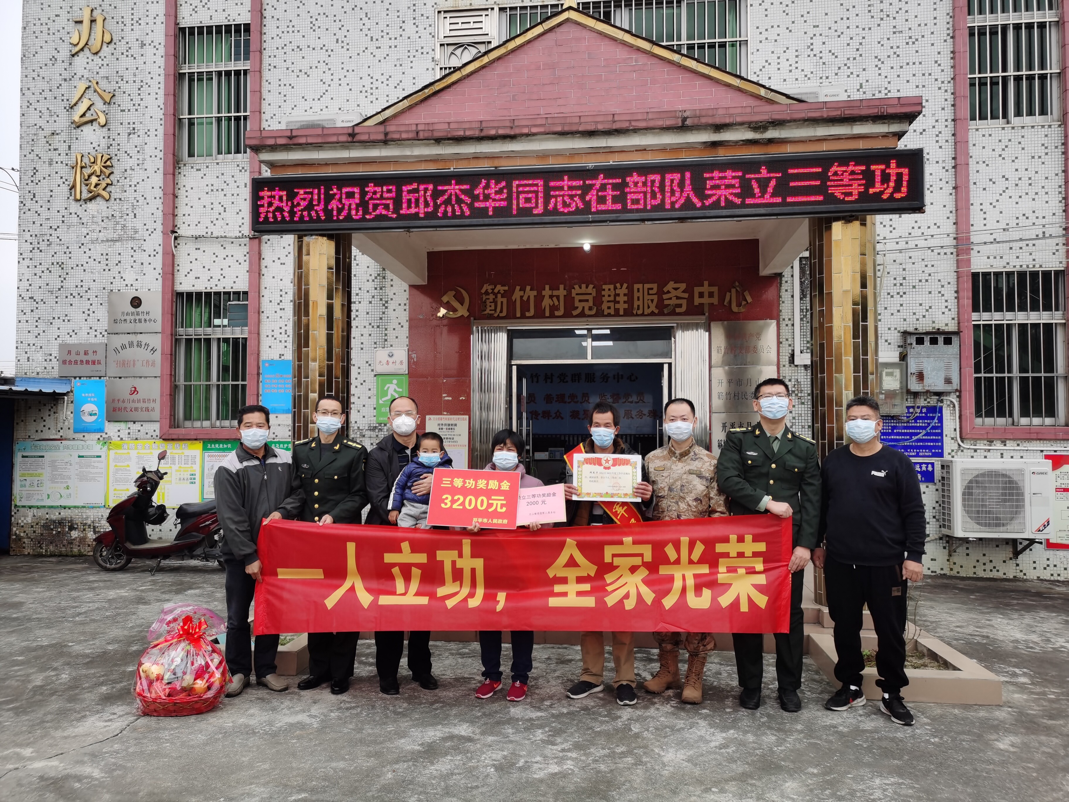 村委會門前,立功受獎軍人家庭父母佩戴大紅綬帶,手捧立功喜報和慰問金,在“熱烈祝賀邱杰華同志在部隊榮立三等功”和“一人立功,全家光榮”醒目橫幅前,同慰問組一行合影留念,現役軍人家庭倍感尊崇和榮光之情溢于言表。