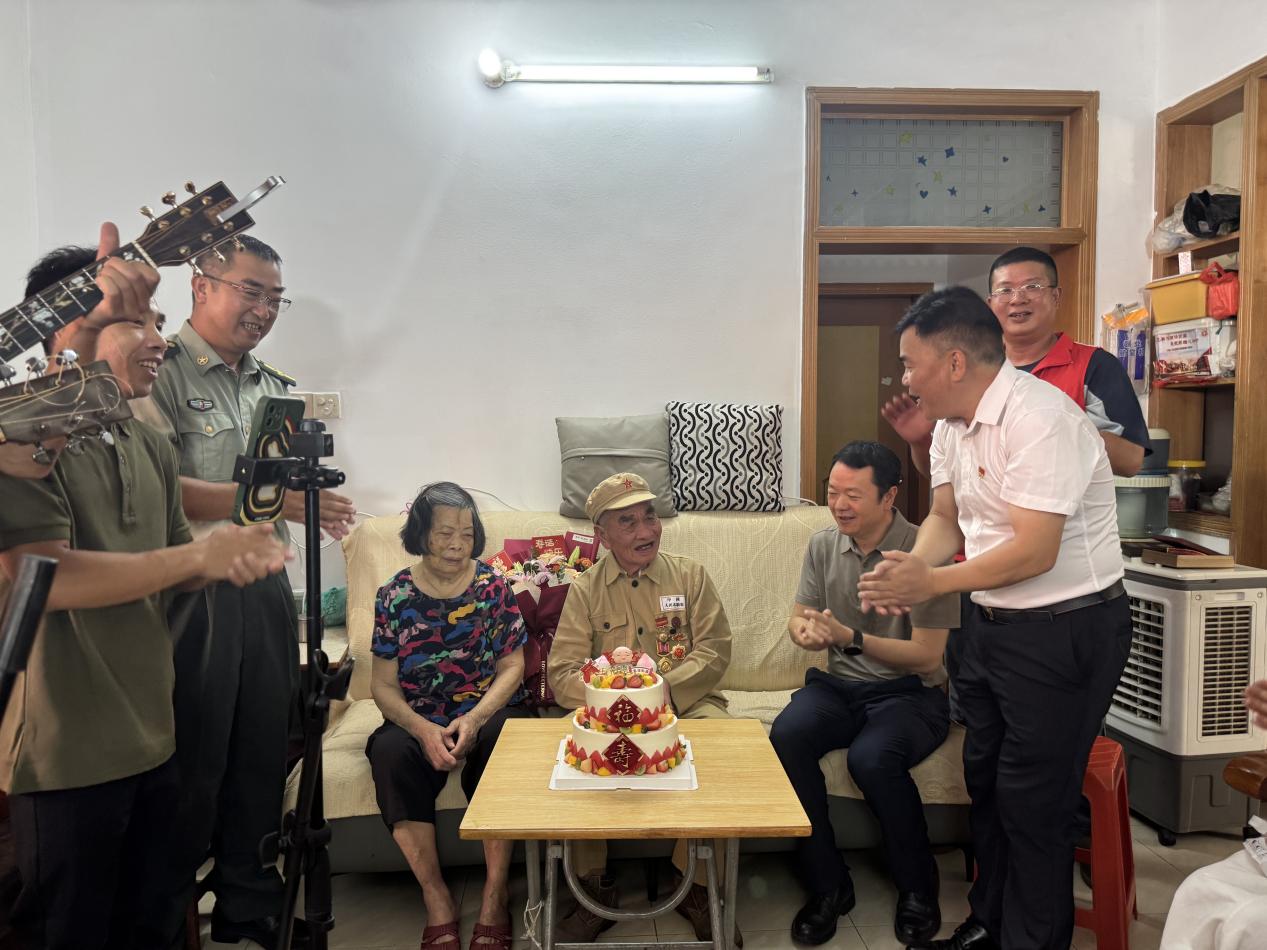 7月9日下午,開平市長沙街道的居民樓里暖意融融。曾參加解放戰爭、抗美援朝戰爭的老兵譚靄云坐在客廳的沙發上,胸前掛著的勛章在午后陽光下閃閃發亮。這天,開平市退役軍人事務局局長張澤康、長沙人武部部長何永富,開平市愛國擁軍促進會黨支部書記譚振勝等十余人帶著鮮花、蛋糕和敬意,提前為老人慶祝7月11日的百歲生日。