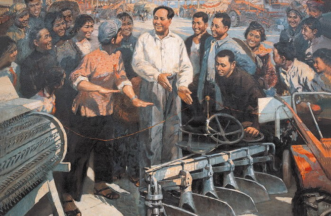 火傘高張,樹蔭合地,蟬聲滿耳。嶺南盛暑,礫石流金。何須理會,閑來搖一艇小舟,泛粼粼清波,依水處,小橋旁,茅舍數間,修竹幾叢。曲徑蜿蜒去,一身醉入百果園,原來是這般嫣紅姹紫開遍,浮翠流丹盡現。珠水之畔,二沙島岸,李醒韜把夢香居遍栽之瓜果呈奉,以斑斕之色,著成無限瀟灑無限涼的詩情。 石榴、荔枝、蓮霧、紅柿、楊桃……滿眼琳瑯,逞嬌呈美。李醒韜筆下種出嶺南佳果,皆嬌妍欲滴,果香四溢,惹人伸手偷摘。試看垂垂石榴,若明珠串串,如火閃爍;再觀荔枝,白玉薄籠妖色映,茜裙輕裼暗香飄;又有芭蕉,似是醉來將墨掃,伴以佳果旁,滴滴雨,葉葉風,好一片繽紛瓜果地,累累串串間,醞釀出如夢如幻的悠揚與清逸。 歷代花鳥畫作盈千累萬,個中好手亦更仆難數,李醒韜何以獨樹一幟? 其言:一是世人畫花,題材千篇一律,了無新趣,吾自畫果兼畫花,果為主,花為輔,另辟蹊徑。二是主攻南方佳果,品類多、肉豐厚、色飽滿。李醒韜曾為此赴科研所長期觀察,家里亦種諸多石榴?!拔业氖癞嬵H受歡迎。石榴又稱吉祥果,民間寓意多子多福。”于此,李醒韜頗為自得。三者,將蒼厚雄勁之風格注入南方的靈動清潤中,構圖大開大合,色澤更如彩練漫天舞,練過留痕,便是瓜果簇簇。李醒韜有最大花鳥畫10米長,2米高,超越自然,氣勢自見。 李醒韜色彩修煉數十載,油畫、宣傳畫、水彩、水粉乃至國畫,縱橫馳騁,均無俗氣。李醒韜時刻自我警惕,國畫之道,需牢牢把握傳統筆墨,西畫色彩只是借鑒配合。他的花鳥,色彩集中在果,無論赤橙黃綠青藍紫,有冷暖、有明暗;濃淡相生,色墨交融,難調之極。造假之人,易露馬腳,一眼洞穿。難怪乎當年王肇民戲稱李醒韜為“色郎”,既是肯定,更是勉勵。 李醒韜畫路廣,名作多,早載丹青史冊。而近年主攻之國畫,除卻南粵佳果,還有嶺南水鄉。李醒韜出身僑鄉開平,河涌繞稻田,漁舟唱晚霞,是畢生抹之不去的鄉土情愫。雖曾有多次機緣移居國外,李醒韜最終留下,以清新俊逸之筆觸,為故土水鄉立傳——“北方開門見山,大山大水??赡恳?;我生活在珠三角,定位水鄉,最為熟悉最具感情。有評論稱我的山水畫‘有水無山’,此非但定位準確,且國內鮮見?!币欢螘r期后,為尋更雄氣派,李醒韜始落墨花鳥。 《毛主席視察農機館》