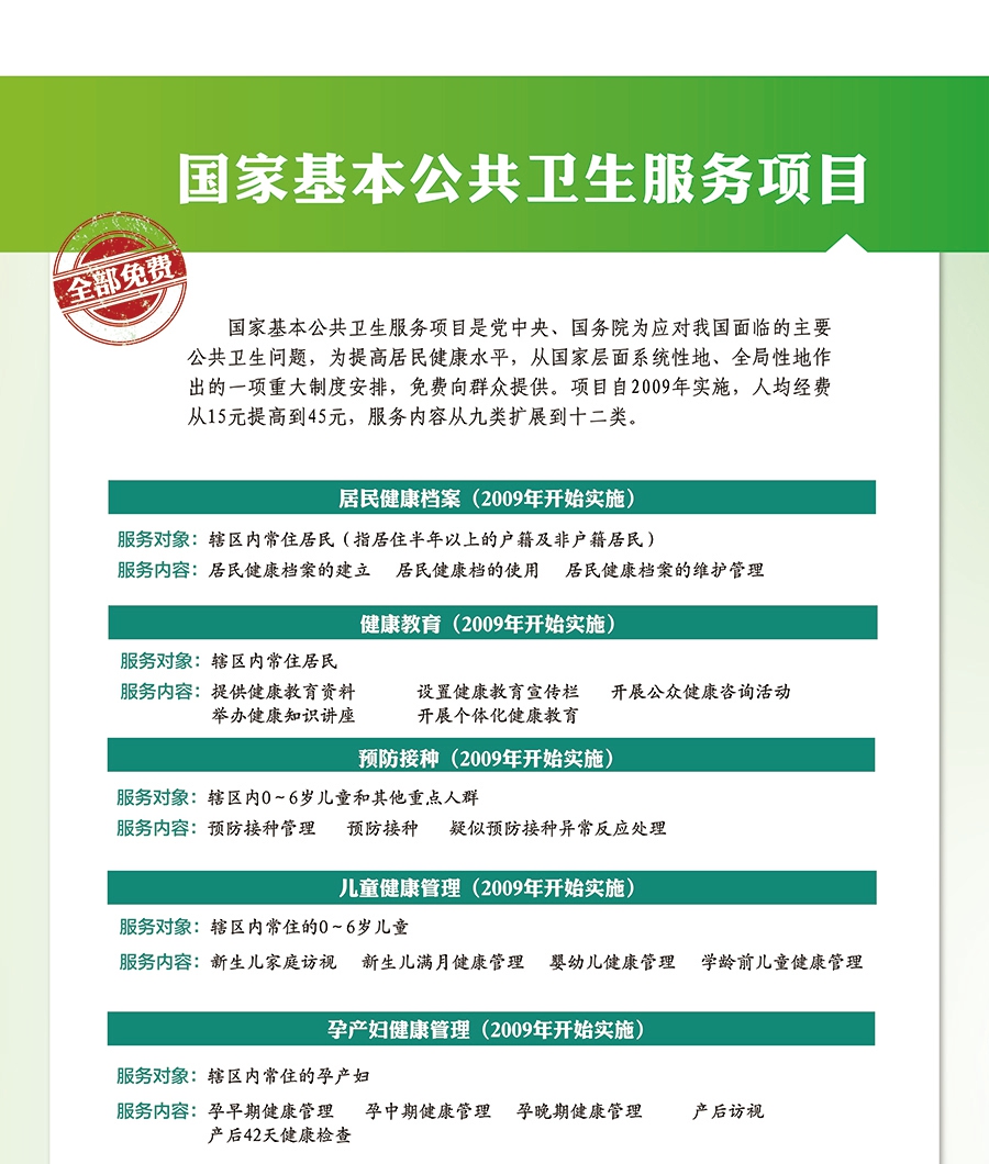 開平市免費提供國家基本公共衛生服務 承擔機構信息公開 為進一步規范國家基本公共衛生服務項目管理,加強對項目實施的監督,現將開平市承擔公共衛生服務的醫療機構相關信息予以公示: 國家基本公共衛生服務項目一覽表 序號 類別 服務對象 項目及內容 一 建立居民 轄區內常住居民,包括居住半年以上非戶籍居民 1.建立健康檔案 2.健康檔案維護管理 二 健康教育 轄區內常住居民 1.提供健康教育資料 2.設置健康教育宣傳欄 3.開展公眾健康咨詢服務 4.舉辦健康知識講座 5.開展個體化健康教育 三 預防接種 轄區內0-6歲兒童和其他重點人群 1.預防接種管理 2.預防接種 3.疑似預防接種異常反應處理 四 兒童健 轄區內常住的0-6歲兒童 1.新生兒家庭訪視 2.新生兒滿月健康管理 3.嬰幼兒健康管理 4.學齡前兒童健康管理 五 孕產婦 轄區內常住的孕產婦 1.孕早期健康管理 2.孕中期健康管理 3.孕晚期健康管理 4.產后訪視 5.產后42天健康檢查 六 老年人 轄區內65歲及以上常住居民 1.生活方式和健康狀況評估 2.體格檢查 3.輔助檢查 4.健康指導 七 慢性病患者 轄區內35歲及以上常住居民中原發性高血壓患者、2型糖尿病患者 1.檢查發現 2.隨訪評估和分類干預 3.健康體檢 八 嚴重精神 轄區內常住居民中診斷明確、在家居住的嚴重精神障礙患者 1.患者信息管理 2.隨訪評估和分類干預 3.健康體檢 九 結核病患者 轄區內常住肺結核患者 1.篩查及推介轉診 2.第一次入戶隨訪 3.督導服藥和隨訪管理 4.結案評估 十 中醫藥 轄區內65歲及以上常住居民和0-36個月兒童 1.老年人中醫體質辨識 2.兒童中醫藥調養 十一 傳染病及 轄區內服務人口 1.傳染病疫情和突發公共衛生事件風險管理 2.傳染病和突發公共衛生事件的發現和登記 3.傳染病和突發公共衛生事件先關信息報告 4.傳染病及突發公共衛生事件的處理 十二 衛生計生 轄區內居民 1.食源性疾病及相關信息報告 2.飲用水衛生安全巡查 3.學校衛生服務 4.非法行醫及非法采供血信息報告 5.計劃生育及相關信息報告 十三 免費提供 1.省級衛生計生部門作為本地區免費避孕藥具采購主體依法實施避孕藥具采購 2.省、地市、縣級計劃生育藥具管理機構負責免費避孕藥具存儲、調撥等工作 十四 健康素養 1.健康促進縣(區)建設 2.健康科普 3.健康促進醫院和戒煙門診建設 4.健康素養和煙草流行監測 5.12320熱線咨詢服務 6.重點疾病、重點領域及重點人群健康教育 開平市基本公共衛生服務承擔機構信息公開 機構名稱 機構地址 聯系電話 服務內容 水口醫院 開平市水口鎮中山路168號 0750-2737234 詳見《國家基本公共衛生服務項目一覽表》 月山鎮衛生院 開平市月山鎮彼迪大道35號 0750-2786662 沙塘鎮衛生院 開平市沙塘鎮康樂南街 0750-2881856 蒼城鎮中心衛生院 開平市蒼城鎮建新街1號 0750-2828727 龍勝鎮衛生院 開平市龍勝鎮西龍街24號 0750-2855991 大沙鎮衛生院 開平市大沙鎮康樂街1號 0750-2899214 馬岡鎮衛生院 開平市馬岡鎮人民街41號 0750-2877421 塘口鎮衛生院 開平市塘口鎮潭溪圩新潭路9、11號 0750-2671334 赤坎鎮中心衛生院 開平市赤坎鎮圩地街53號 0750-2626583 百合鎮衛生院 開平市百合鎮北郊34號 0750-2516223 蜆岡鎮衛生院 開平市蜆岡鎮興華路37號 0750-2522771 金雞鎮衛生院 開平市金雞鎮銀龍路33號 0750-2555346 赤水鎮衛生院 開平市赤水鎮中山路18號 0750-2577546 三埠街道辦事處 開平市荻海中和路272號 0750-2338189 詳見《國家基本公共衛生服務項目一覽表》 三埠街道辦事處 開平市長沙東郊南區36號101 0750-2290699 三埠街道辦事處 開平市祥龍中路6號首層105-107 0750-2367639 三埠街道辦事處 開平市新昌同興路25號 0750-2380392 三埠街道辦事處 開平市升平路38號1幢101 0750-2231826 長沙街道辦事處 開平市長沙愛民路1號第6幢 0750-2212612(公衛); 0750-2212653(預防接種) 1、提供慢病隨訪服務。 2、開展國家基本公共衛生服務項目免費體檢。 3、預防接種服務。 4、0-6歲兒童體檢服務。 長沙街道辦事處 開平市長沙幕沙路56號1棟 0750-2232779 1、提供慢病隨訪服務。 2、定期開展國家基本公共衛生服務項目免費體檢。 長沙街道辦事處 開平市長沙祥苑北路1號1棟 0750-2278333 1、提供慢病隨訪服務。 2、定期開展國家基本公共衛生服務項目免費體檢。 長沙街道辦事處 開平市長沙僑園路70號1棟 0750-2313203 1、提供慢病隨訪服務。 2、定期開展國家基本公共衛生服務項目免費體檢。 長沙街道辦事處 開平市長沙樓岡樓新路3號 0750-2327474 1、提供慢病隨訪服務。 2、定期開展國家基本公共衛生服務項目免費體檢。 開平市衛生和計劃生育局 公共衛生股監督電話:0750-2221768 國家基本公共衛生服務項目推講 基本公衛十三項,都是免費多轉告! 每人每戶建檔案,健康管理有資料; 孕婦免費做檢查,母子平安最重要; 寶寶要打預防針,按時接種要記牢; 兒童體檢到六歲,兒保手冊要留好; 老人體檢每年有,查血心電加B超; 血壓血糖控制好,定期監測心莫躁; 精神疾病防與治,醫生隨訪來指導; 結核患者不用怕,規范用藥護理好; 中醫服務重老少,保健治療很有效; 突發事件有預案,傳染疾病要上報; 醫療飲水講安全,衛生協管不能少; 健康促進與指導,全民身體素質高; 所需費用國家補,費隨事走事定費。