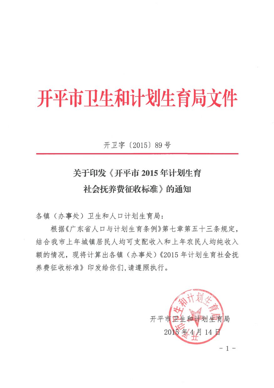 關(guān)于印發(fā)《開平市2015年計劃生育社會撫養(yǎng)費(fèi)征收標(biāo)準(zhǔn)》的通知(開衛(wèi)字[2015]89號)