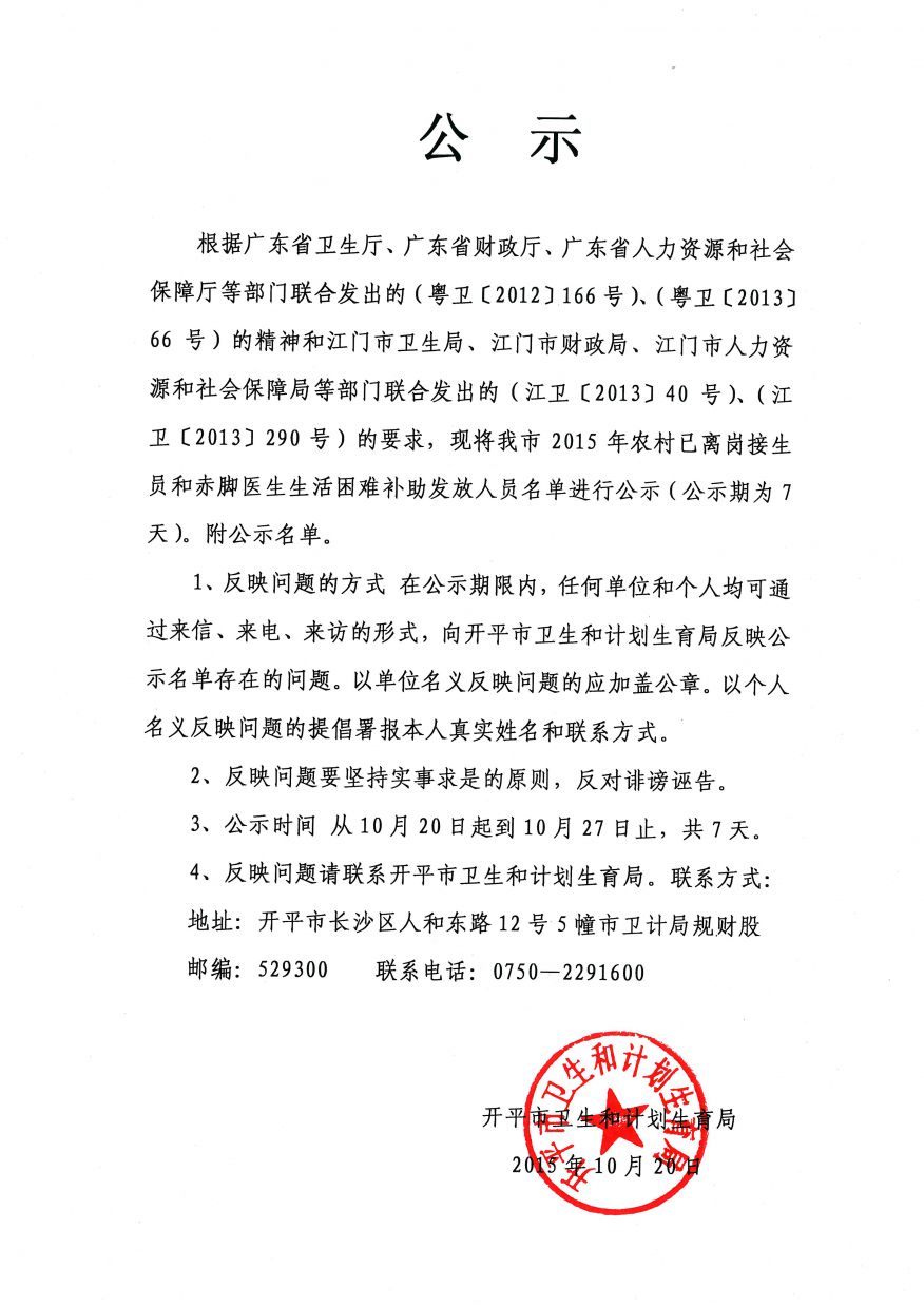 附件:開平市2015年農(nóng)村已離崗接生員和赤腳醫(yī)生生活困難補(bǔ)助發(fā)放人員名單 ??