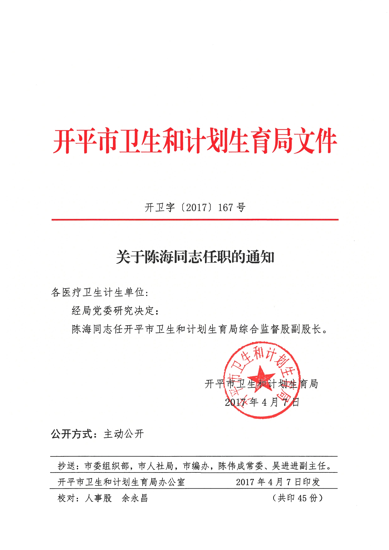 關于陳海同志任職的通知(開衛字〔2017〕167號)