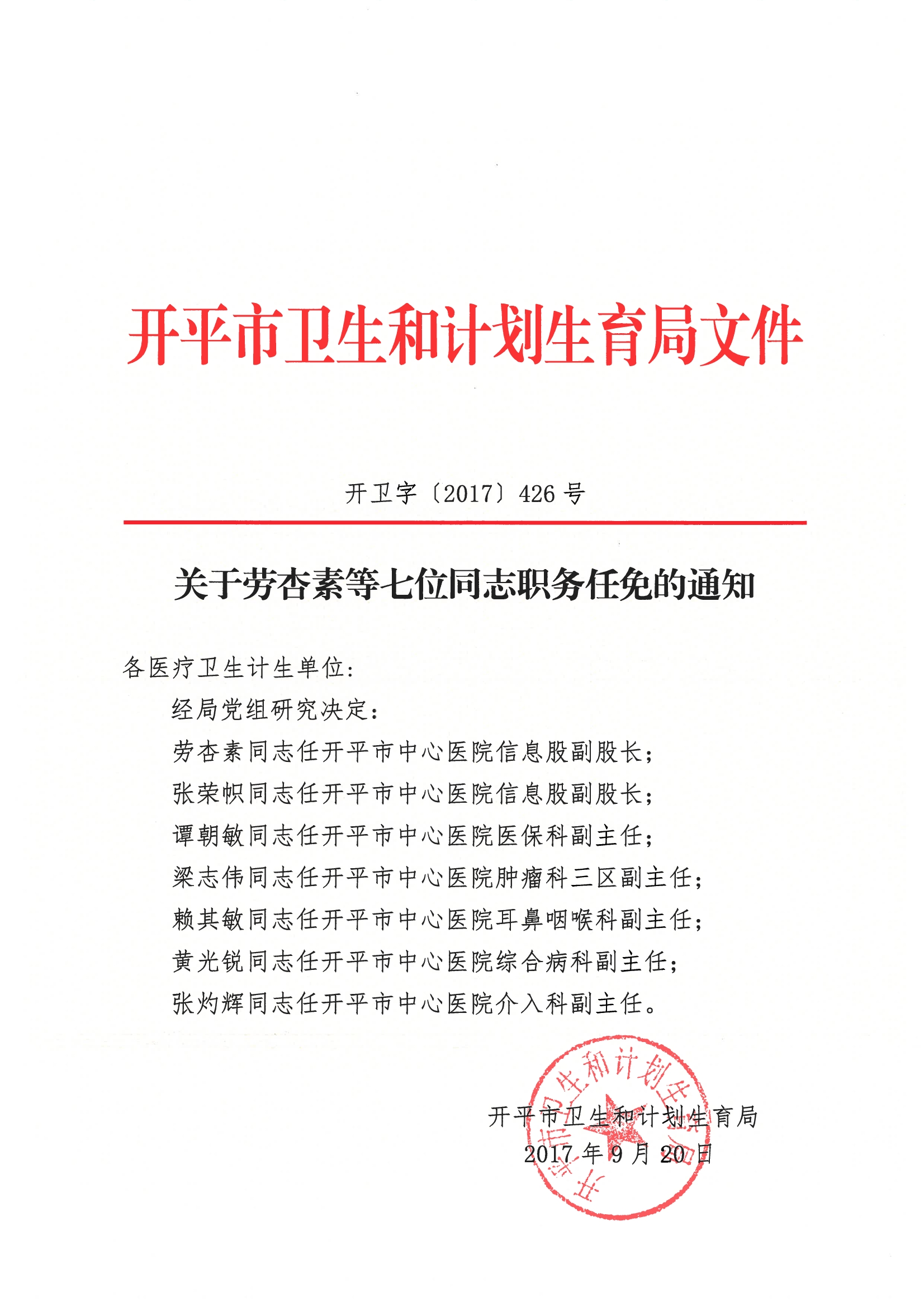關于勞杏素等七位同志職務任免的通知(開衛字〔2017〕426號)