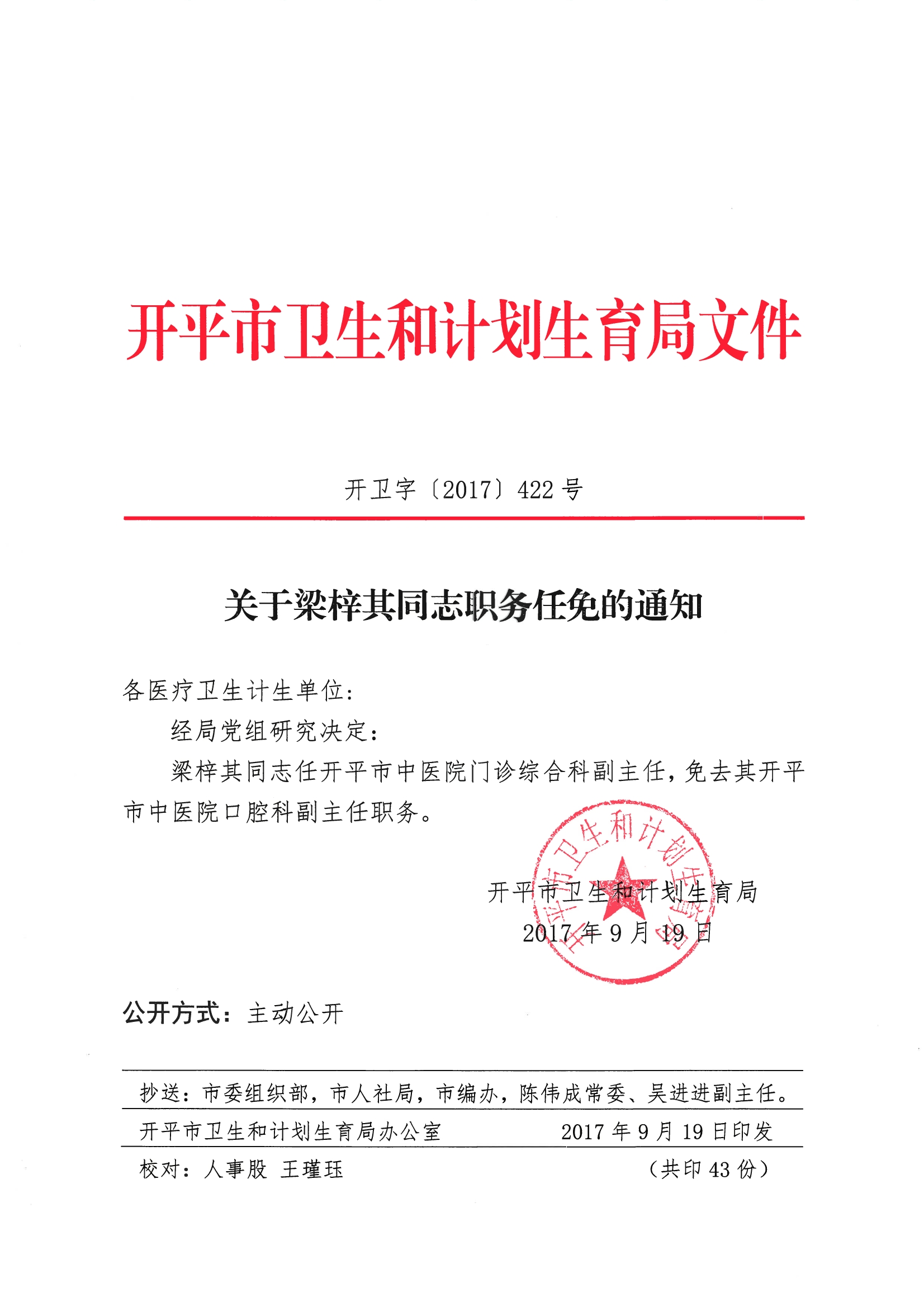 關于梁梓其同志職務任免的通知(開衛字〔2017〕422號)