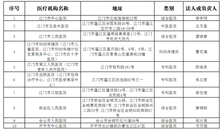 江門市衛生健康局負責核發《醫療機構執業許可證書》的醫療機構基本信息