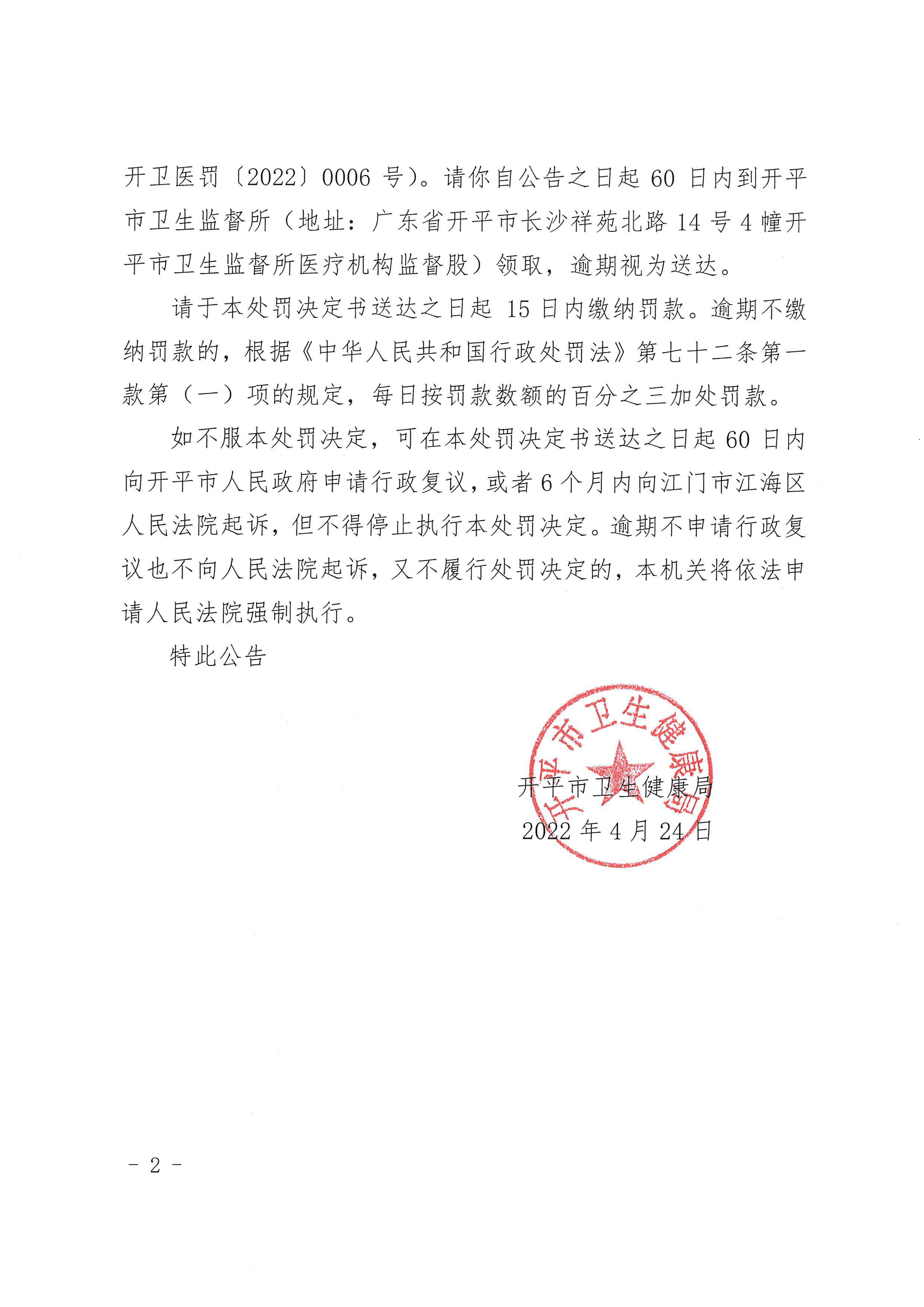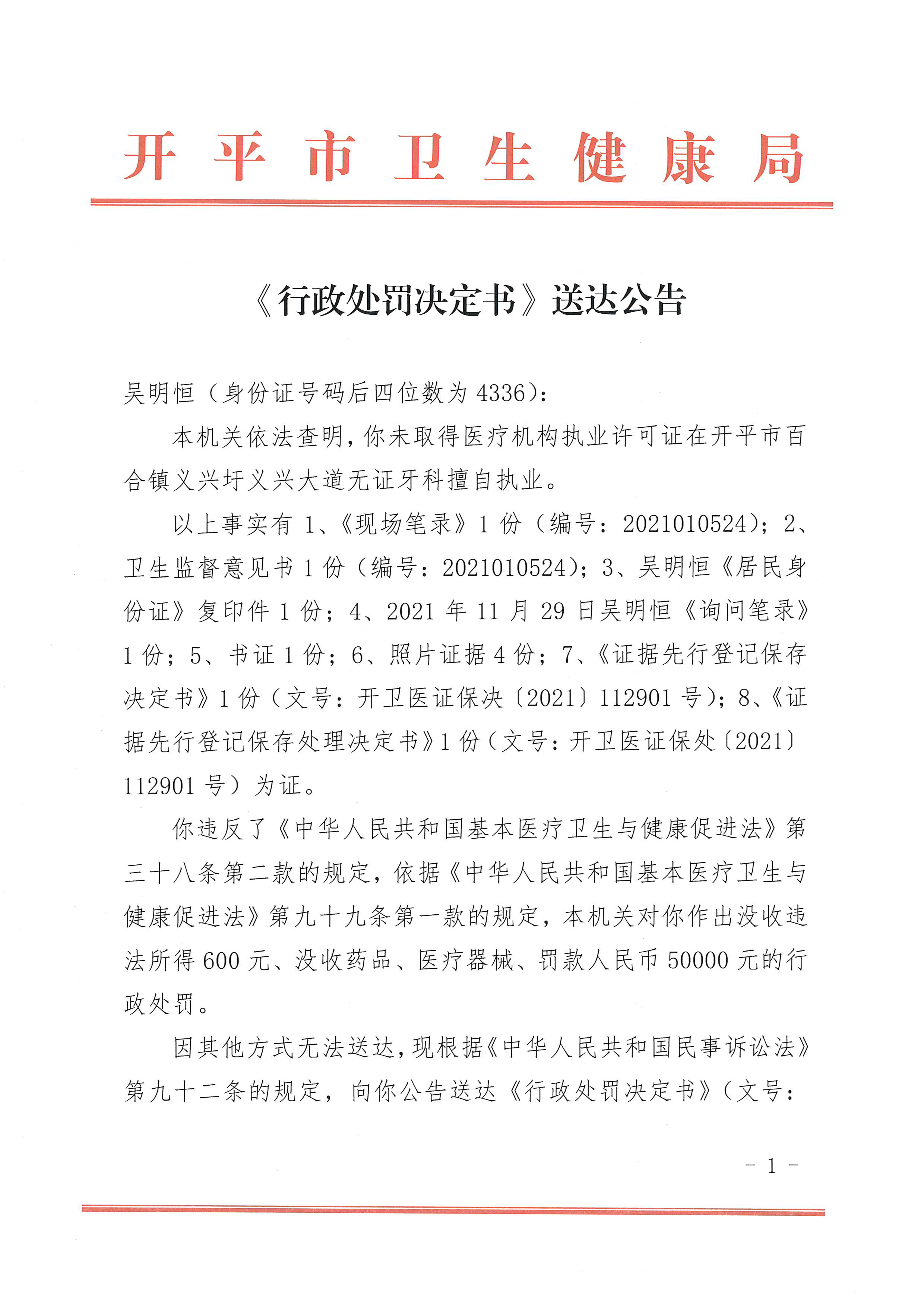 《行政處罰決定書》送達公告 吳明恒(身份證號碼后四位數(shù)為4336): 本機關(guān)依法查明,你未取得醫(yī)療機構(gòu)執(zhí)業(yè)許可證在開平市百合鎮(zhèn)義興圩義興大道無證牙科擅自執(zhí)業(yè)。 以上事實有1、《現(xiàn)場筆錄》1份(編號:2021010524);2、衛(wèi)生監(jiān)督意見書1份(編號:2021010524);3、吳明恒《居民身份證》復印件1份;4、2021年11月29日吳明恒《詢問筆錄》1份;5、書證1份;6、照片證據(jù)4份;7、《證據(jù)先行登記保存決定書》1份(文號:開衛(wèi)醫(yī)證保決〔2021〕112901號);8、《證據(jù)先行登記保存處理決定書》1份(文號:開衛(wèi)醫(yī)證保處〔2021〕112901號)為證。 你違反了《中華人民共和國基本醫(yī)療衛(wèi)生與健康促進法》第三十八條第二款的規(guī)定,依據(jù)《中華人民共和國基本醫(yī)療衛(wèi)生與健康促進法》第九十九條第一款的規(guī)定,本機關(guān)對你作出沒收違法所得600元、沒收藥品、醫(yī)療器械、罰款人民幣50000元的行政處罰。 因其他方式無法送達,現(xiàn)根據(jù)《中華人民共和國民事訴訟法》第九十二條的規(guī)定,向你公告送達《行政處罰決定書》(文號:開衛(wèi)醫(yī)罰〔2022〕0006號)。請你自公告之日起60日內(nèi)到開平市衛(wèi)生監(jiān)督所(地址:廣東省開平市長沙祥苑北路14號4幢開平市衛(wèi)生監(jiān)督所醫(yī)療機構(gòu)監(jiān)督股)領(lǐng)取,逾期視為送達。 請于本處罰決定書送達之日起 15日內(nèi)繳納罰款。逾期不繳納罰款的,根據(jù)《中華人民共和國行政處罰法》第七十二條第一款第(一)項的規(guī)定,每日按罰款數(shù)額的百分之三加處罰款。 如不服本處罰決定,可在本處罰決定書送達之日起60日內(nèi)向開平市人民政府申請行政復議,或者6個月內(nèi)向江門市江海區(qū)人民法院起訴,但不得停止執(zhí)行本處罰決定。逾期不申請行政復議也不向人民法院起訴,又不履行處罰決定的,本機關(guān)將依法申請人民法院強制執(zhí)行。 特此公告 開平市衛(wèi)生健康局 2022年4月24日