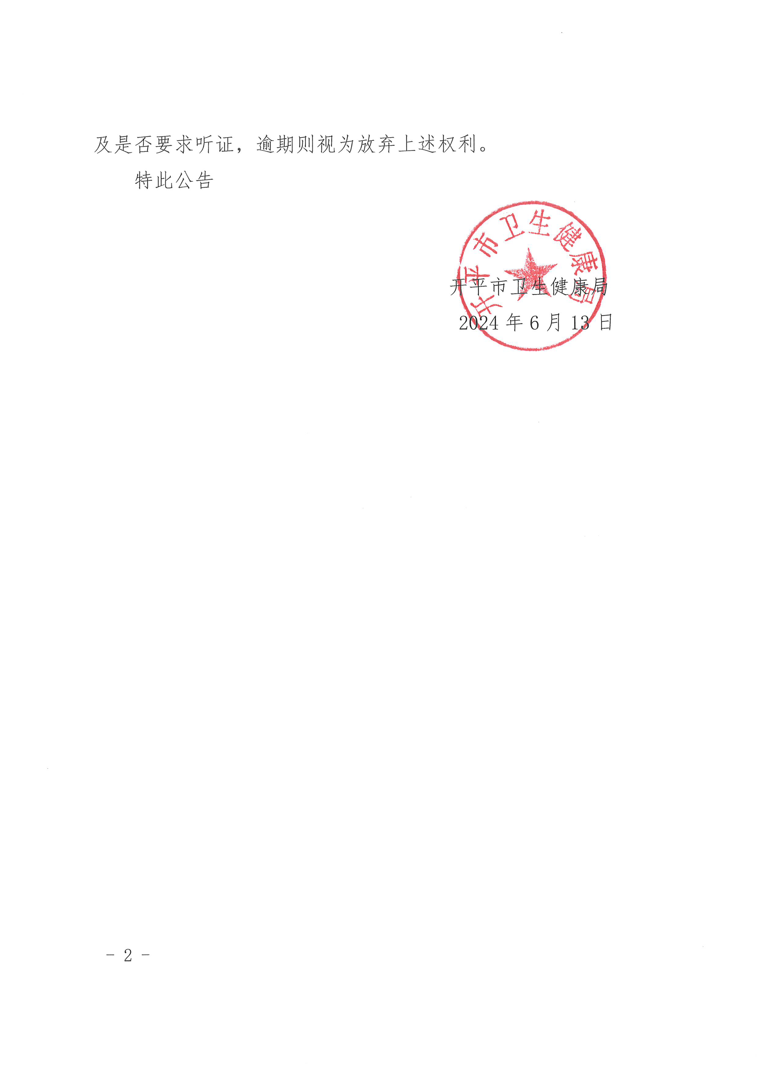 謝勇(身份證號碼后四位數(shù)為4019): 本機關(guān)依法查明,你在開平市長沙街道開平大道1號16幢1座之二2105公寓開平市長沙半束美容中心非醫(yī)師行醫(yī)的行為,違反了《中華人民共和國醫(yī)師法》第十三條第四款的規(guī)定,依據(jù)《中華人民共和國醫(yī)師法》第五十九條的規(guī)定,本機關(guān)擬對你作出1、責令停止非法執(zhí)業(yè)活動;2、沒收藥品、醫(yī)療器械;3、罰款人民幣貳萬元(¥20000元)的行政處罰。 因其他方式無法送達,現(xiàn)根據(jù)《中華人民共和國民事訴訟法》第九十五條的規(guī)定,向你公告送達《行政處罰事先告知書》(文號開衛(wèi)醫(yī)罰告〔2024〕11號)。依照《中華人民共和國行政處罰法》第七條第一款、第四十四條、第四十五條第一款、第六十三條、第六十四條第一款的有關(guān)規(guī)定,你享有陳述、申辯及要求聽證的權(quán)利,你提出的事實、理由和證據(jù),經(jīng)本機關(guān)復核成立的,本機關(guān)將予以采納。如果你放棄陳述、申辯和聽證的權(quán)利,本機關(guān)將按照上述事實、理由和依據(jù)作出行政處罰決定。 本公告發(fā)出之日起,經(jīng)過30日即視為送達。請你在公告期間或公告送達之日起五日內(nèi)與開平市衛(wèi)生健康局二樓政策法規(guī)股聯(lián)系(電話:0750-2235208),書面告知陳述和申辯的內(nèi)容以及是否要求聽證,逾期則視為放棄上述權(quán)利。 特此公告 開平市衛(wèi)生健康局 2024年6月13日