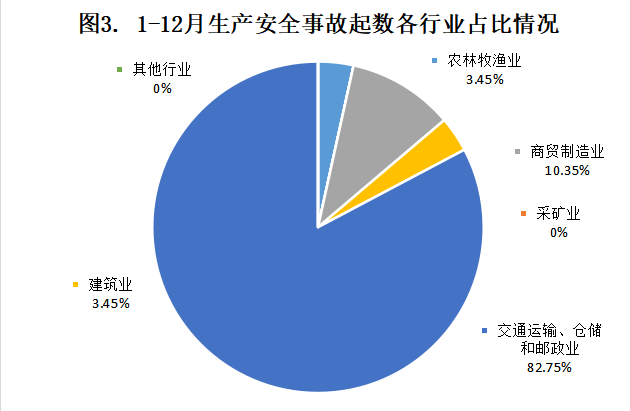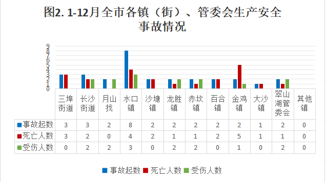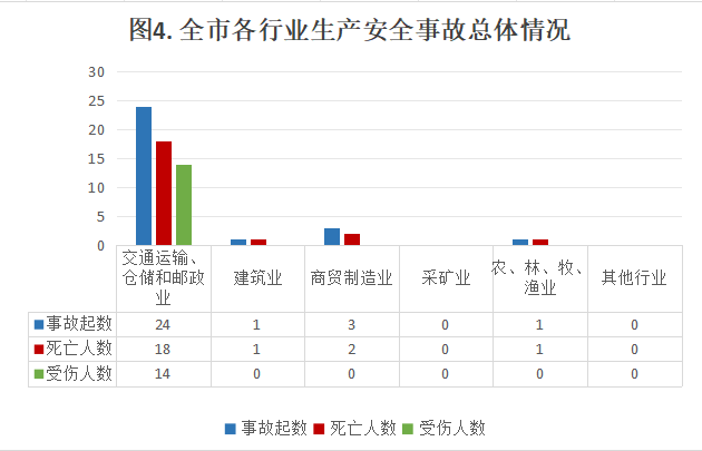 內容摘要 2023年1-12月,全市發生生產安全事故29起、死亡22人、受傷14人、直接經濟損失442.43萬元。 一、1-12月生產安全事故概況 全市發生生產安全事故29起、死亡22人、受傷14人、直接經濟損失442.43萬元,同比分別減少4起、減少2人、增加1人、增加435.53萬元,事故起數、死亡人數、受傷人數、直接經濟損失同比分別下降12.1%、下降8.3%、上升7.7%、上升6312%。 二、各鎮(街)、翠山湖管委會事故情況 三埠街道發生交通運輸、倉儲和郵政業事故2起,建筑業事故1起;長沙街道發生交通運輸、倉儲和郵政業事故2起,商貿制造業事故1起;月山鎮發生交通運輸、倉儲和郵政業事故2起;水口鎮發生交通運輸、倉儲和郵政業事故7起,商貿制造業事故1起;沙塘鎮發生交通運輸、倉儲和郵政業事故1起,商貿制造業事故1起;龍勝鎮發生交通運輸、倉儲和郵政業事故2起;赤坎鎮發生交通運輸、倉儲和郵政業事故2起;百合鎮發生交通運輸、倉儲和郵政業事故2起;金雞鎮發生交通運輸、倉儲和郵政業事故2起;大沙鎮發生農林牧漁業事故1起;翠山湖管委會發生交通運輸、倉儲和郵政業事故2起;其他鎮沒有發生生產安全事故。 三、全市各行業事故情況 (一)各行業事故占比情況 全市共發生生產安全事故29起,其中交通運輸、倉儲和郵政業24起,占82.75%;商貿制造業3起,占10.35%,建筑業1起,占3.45%;農林牧漁業1起,占3.45%,采礦業和其他行業未發生生產安全事故。 (二)各行業事故基本情況 (1)農林牧漁業。發生1起事故,去年同期未發生事故。 (2)采礦業。未發生事故,去年同期未發生事故。 (3)商貿制造業。發生3起事故,去年同期未發生事故。 (4)建筑業。發生1起事故,去年同期未發生事故。 (5)交通運輸、倉儲和郵政業。發生事故24起(其中道路運輸24起)、死亡18人,去年同期發生事故33起、死亡24人,事故起數和死亡人數同比分別下降27.3%、下降25%。 (6)其他行業。未發生事故,去年同期未發生事故。 四、1-12月生產安全事故特點 1.道路交通領域安全總體形勢平穩,但依然嚴峻。1-12月,全市發生道路運輸事故24起、死亡18人、受傷14人,事故起數、死亡人數、受傷人數同比分別下降27.3%、下降25%、上升7.7%,事故起數、死亡人數實現“雙下降”。 2.工礦商貿領域安全形勢嚴峻。1-12月,全市商貿制造業發生3起事故,死亡2人,事故起數、死亡人數同比上升300%、上升200%,安全形勢不容樂觀。 3.建筑業、農林牧漁業等行業領域安全總體形勢可控。1-12月,全市建筑業發生1起事故,死亡1人;農林牧漁業發生1起事故,死亡1人,其他行業未發生生產安全事故。 五、下一步工作措施 1.提高政治站位,樹牢安全發展理念。深入學習習近平總書記關于安全生產的重要指示批示精神,不斷強化紅線意識和底線思維,統籌好發展和安全,始終把“人民至上、生命至上”的理念貫穿到經濟建設發展各項工作中;各行業主管部門要進一步提高政治站位,嚴格按照“三個必須”的要求,按照“黨政同責、一崗雙責、齊抓共管、失職追責”要求,狠抓安全生產責任和工作措施落實,全力確保我市安全生產形勢穩定;全市各類生產經營單位要清醒認識安全生產工作對企業生存發展的重要意義,切實將“安全第一”的理念和自身主體責任落實到生產經營活動中。 2.強化安全監管及宣傳,抓好重點領域的專項治理。各級各部門要結合當前安全風險管控特點,科學部署,標本兼治,在出重拳、用實招、求實效上下功夫,持續加大對重點領域的管控力度。道路交通方面,針對交通繁忙的時間段,突出長途客車、旅游包車、危化品運輸車輛等重點車輛,強化對重點運輸企業的執法檢查,嚴厲打擊“三超一疲勞”等交通違法違規行為,同時要持續加大道路交通安全宣傳,提高全民安全出行意識;消防安全方面,要加強對熱點度假區景區、大型商業綜合體、餐飲娛樂、賓館民宿等人員密集場所的安全隱患排查和消防監督執法,提高消防防范意識;建筑施工方面,要嚴防各類項目趕工期、搶進度以及惡劣天氣條件下冒險施工、違規作業等引發坍塌,火災等事故,嚴防違規裝飾裝修、擅自用作經營引發群死群傷事故。 3.加強特殊危險作業安全管理,落實審批和專人監護。生產經營單位應當依照相關法律法規、規程規章的要求制定完善特殊危險作業安全管理制度,明確特殊危險作業的種類、范圍、職責、審批權限及流程、安全條件確認、監護、應急等相關要求。生產經營單位進行吊裝、動火、臨時用電、高處作業以及國務院應急管理部門會同國務院有關部門規定的其他危險作業時,應嚴格開展危險作業審批。進行危險作業時,須安排專門人員進行現場安全管理,確保操作規程的遵守和安全措施的落實。