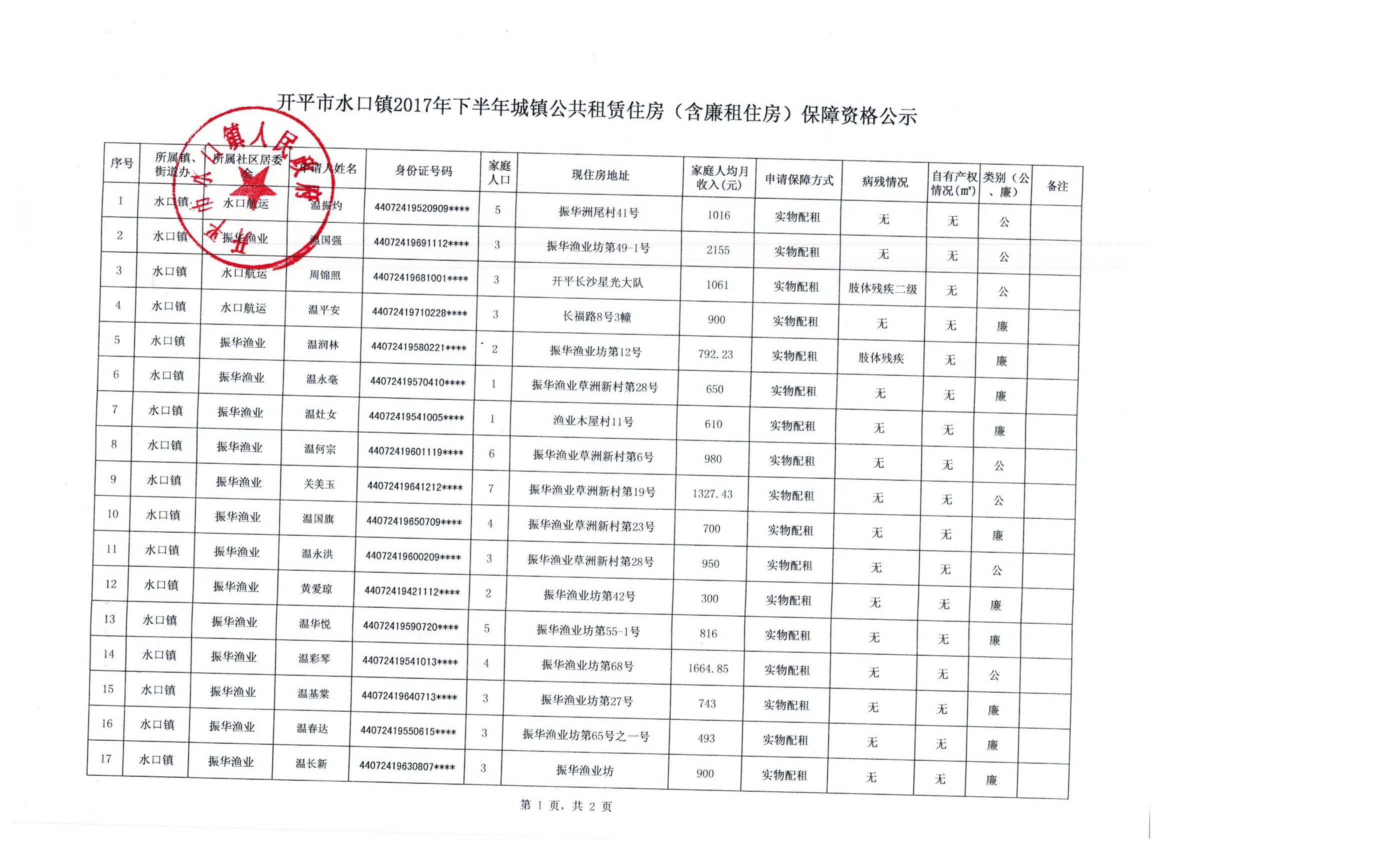 開平市水口鎮2017年下半年城鎮公共租賃住房(廉租住房)保障資格公示