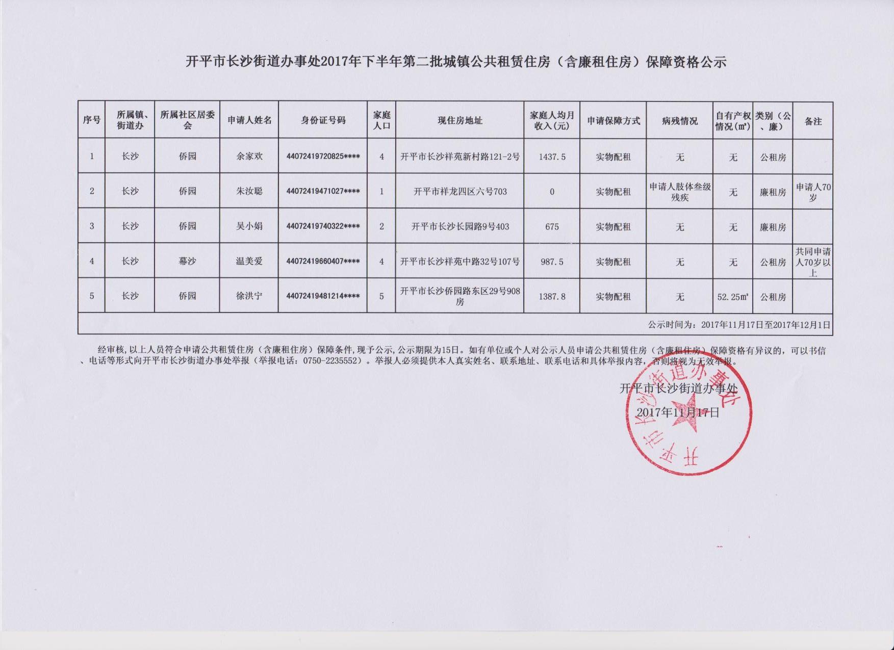 開平市長沙街道辦事處2017年下半年第二批城鎮公共租賃住房(含廉租住房)保障資格公示