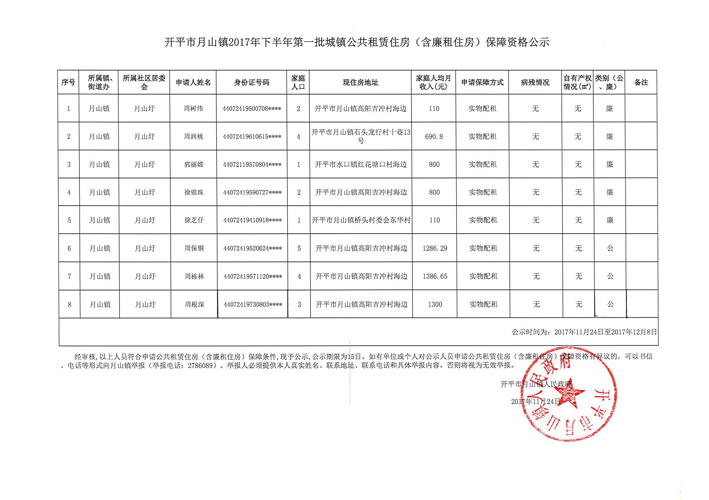 開(kāi)平市月山鎮(zhèn)2017年下半年第一批城鎮(zhèn)公共租賃住房(含廉租住房)保障資格公示