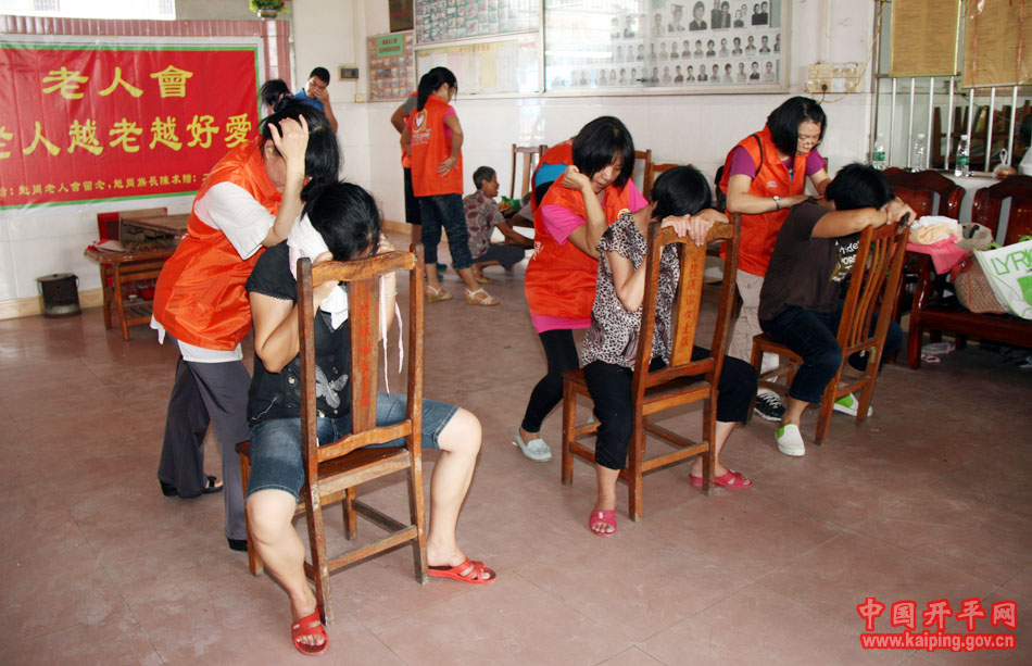 據悉,這是義工聯首次組織社區義工到鄉鎮開展活動。早上八點左右,僑園社區15名義工攜帶相關的活動工具來到塘口鎮,在距離鎮政府不到3公里的魁崗村陳氏大樓布置現場。大樓門口四張椅子一字排開,義剪隊為村民理發,還有“導師”負責現場指導學員;樓內原始點按摩義工隊為有需要的群眾進行按摩。