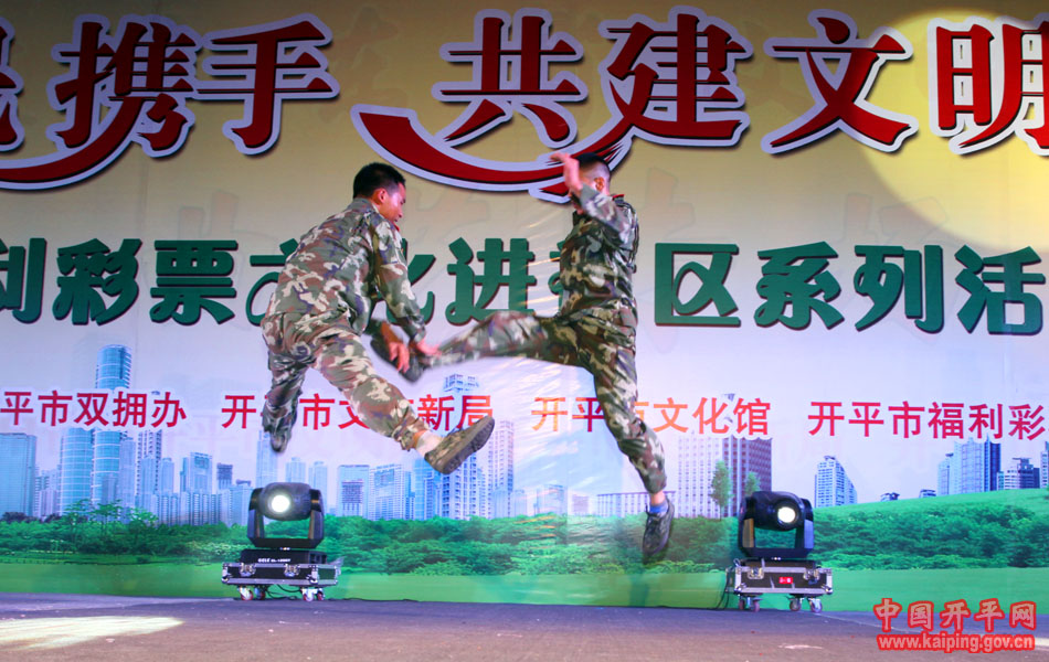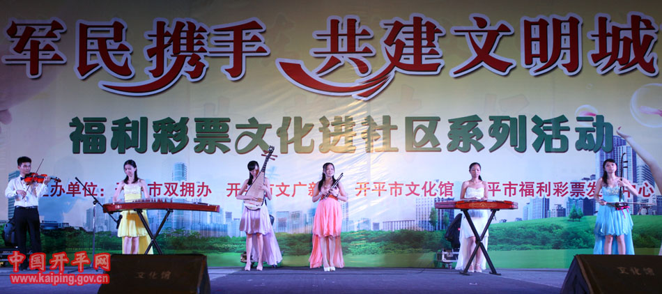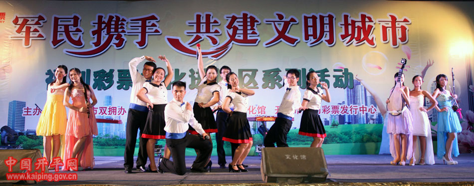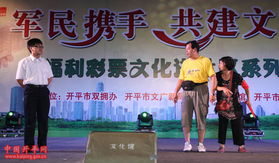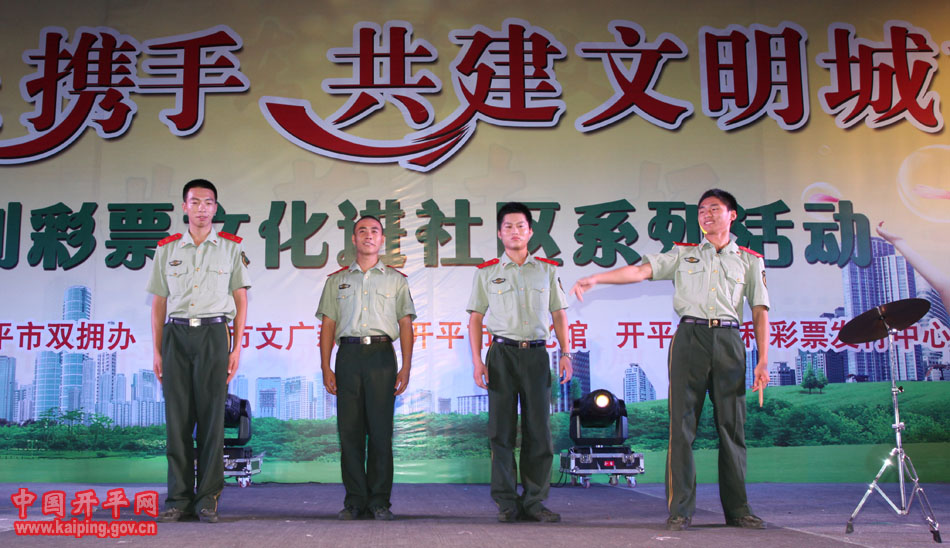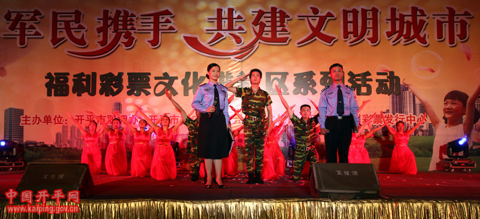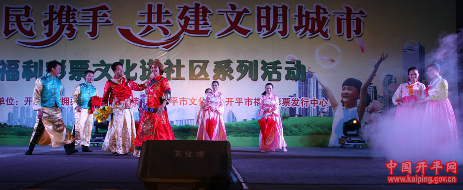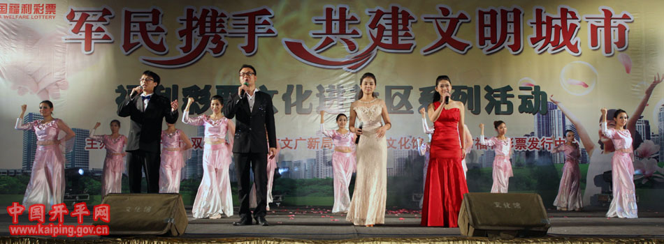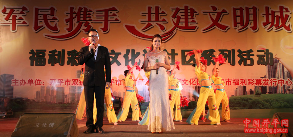 特別是在5日晚的“軍民攜手·共建文明城市—福利彩票文化進社區系列活動”中上演的開平民歌《洋妹喜嫁開平郎》,更是贏得現場觀眾的好評。該節目是用賣雞調、夾房歌、禾樓歌等豐富的開平民歌音樂結合地方傳統婚慶禮儀,講述了美國姑娘洋妹與“開平仔”在美國同窗四年,共同研究建筑史,在研討“開平碉樓的保護工作”中志同道合,共諧連理,洋妹嫁到開平來的故事,進一步展現了開平民歌深厚的文化底蘊和開平碉樓的迷人魅力。