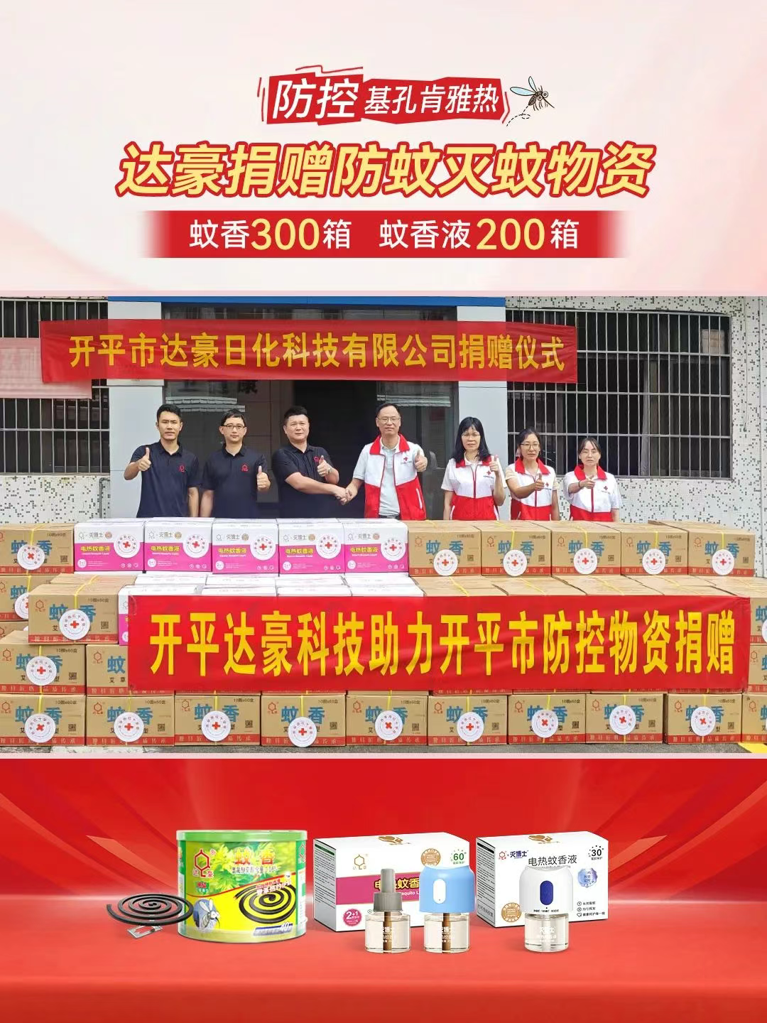 開平市達(dá)豪日化科技有限公司是一家專門生產(chǎn)銷售“除四害”產(chǎn)品的本土企業(yè),在獲悉開平市防蚊滅蚊需求后,積極對接相關(guān)職能部門,通過開平市紅十字會向開平市捐贈了7500盒蚊香、1500盒電熱蚊香液,以實(shí)際行動彰顯企業(yè)的社會責(zé)任與擔(dān)當(dāng)。