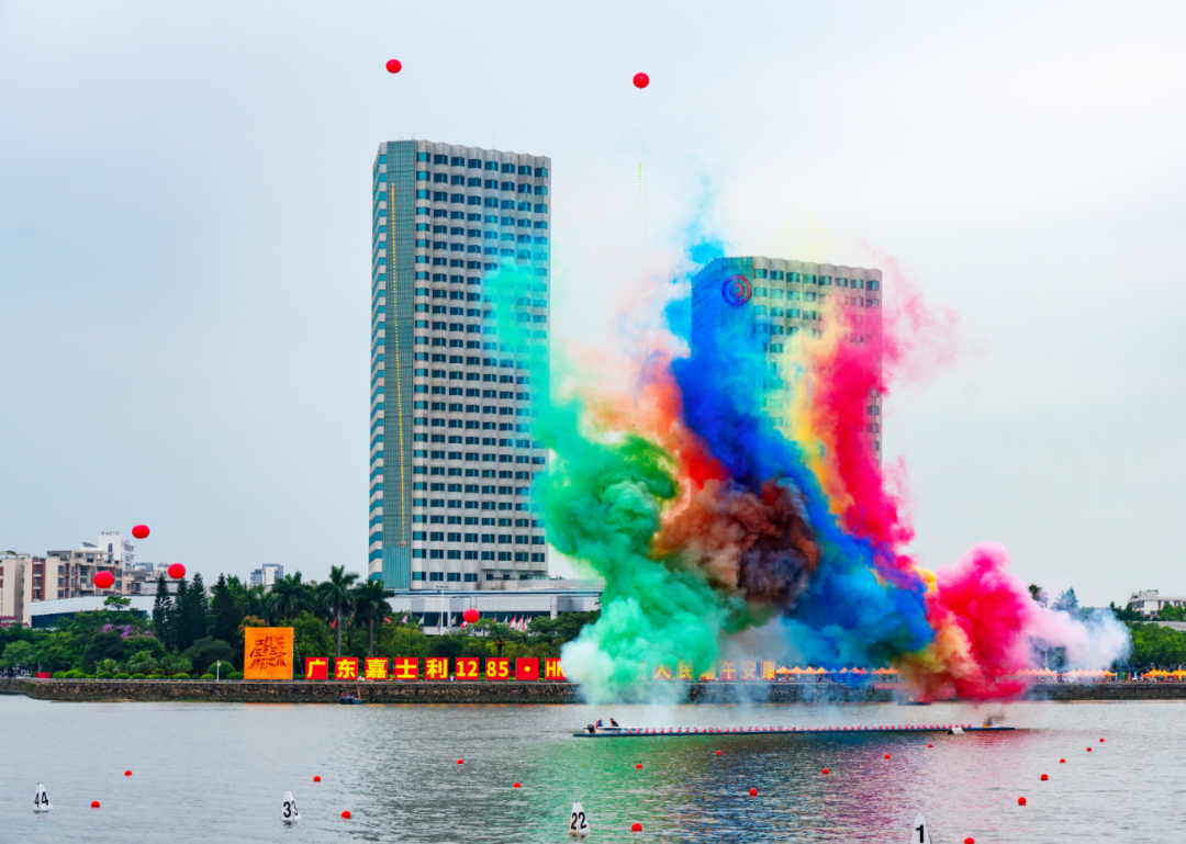 仲夏時節的潭江河畔,鼓聲震天,浪花激揚。隨著水面冷煙花的璀璨綻放和開賽令下,一艘艘蓄勢待發的龍舟如離弦之箭般沖破水面。水面之上,鼓點強勁如雷鳴,舵手精準指揮,隊員們弓身發力,整齊的船槳劃破碧波,水花飛濺間展現著力與美的完美融合。