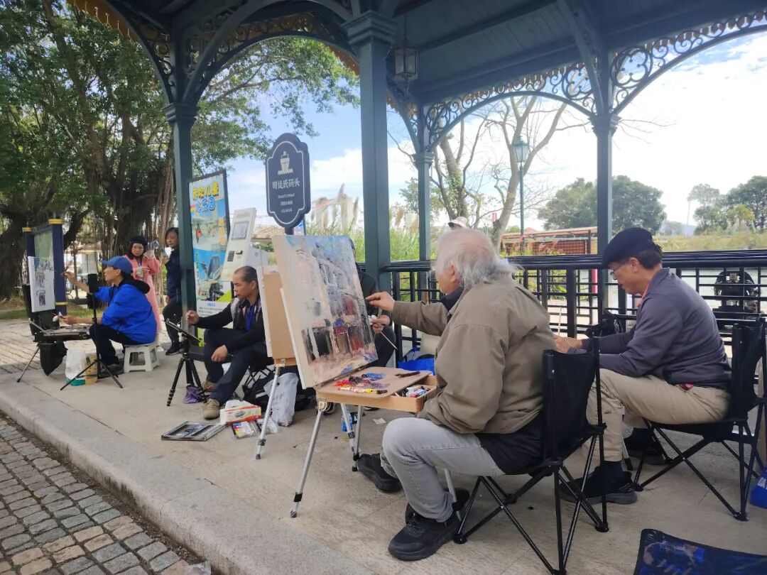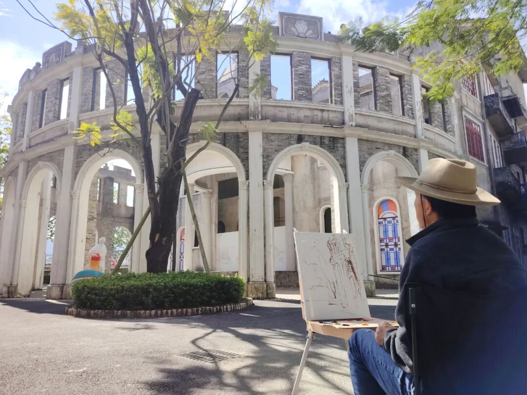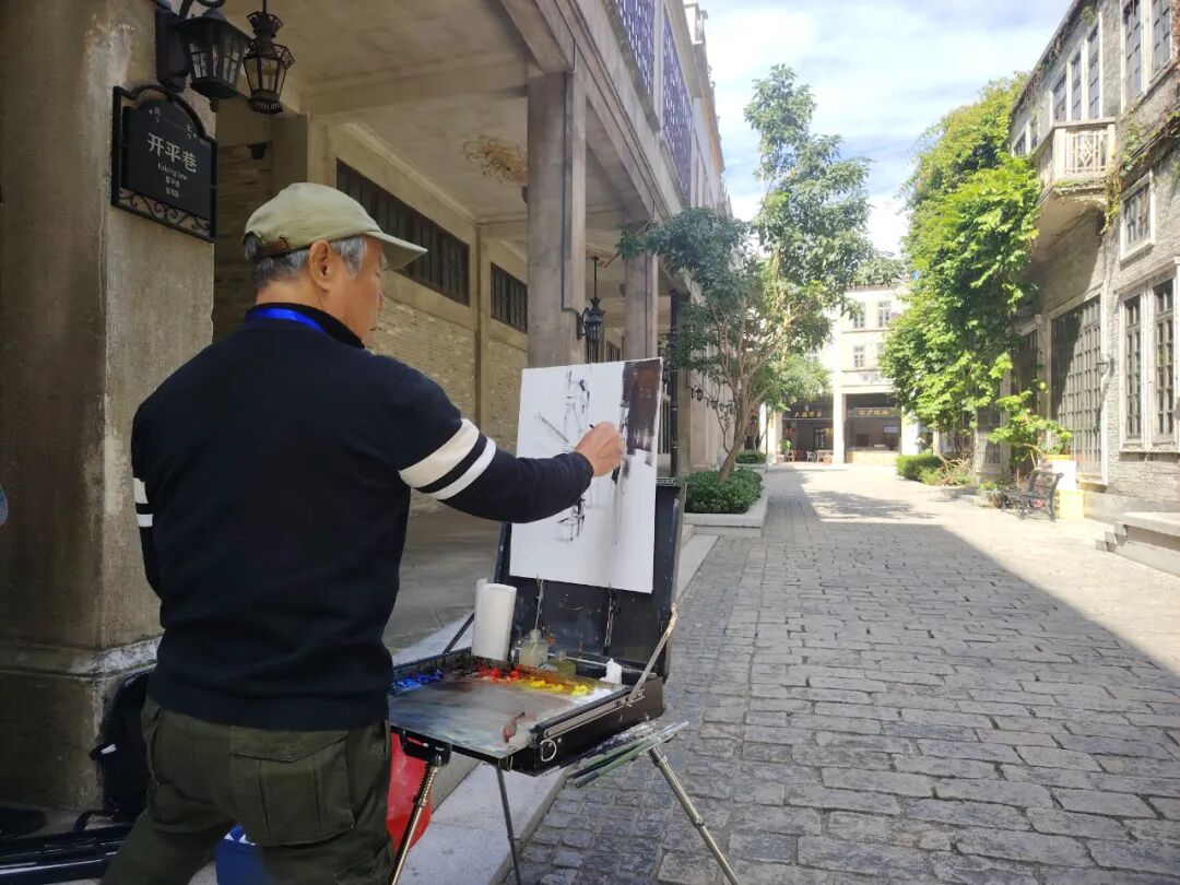 啟動儀式后,美術(shù)家們迅速進入創(chuàng)作狀態(tài)。在赤坎華僑古鎮(zhèn),大家分散于街巷各處,尋找自己心儀的視角,有人面對連片騎樓鋪展畫布,以油彩勾勒建筑風(fēng)貌;也有畫家執(zhí)筆揮墨,以流暢線條捕捉市井煙火,力圖展現(xiàn)僑鄉(xiāng)建筑中西合璧的獨特神韻。