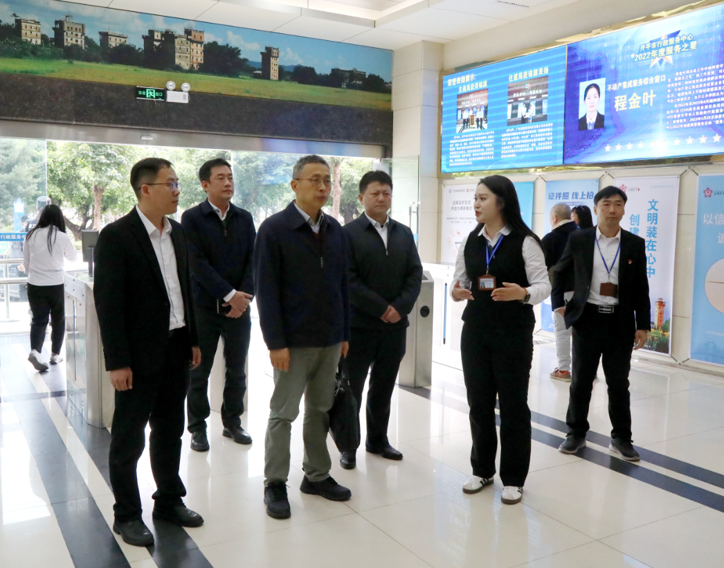 余中華一行首先來到開平市行政服務中心辦事大廳,實地了解窗口服務區(qū)、24小時自助服務區(qū)等功能場室以及大廳智慧政務設備使用、便民服務創(chuàng)新等情況,并召開座談會,聽取市政數(shù)局主要負責人工作情況匯報。