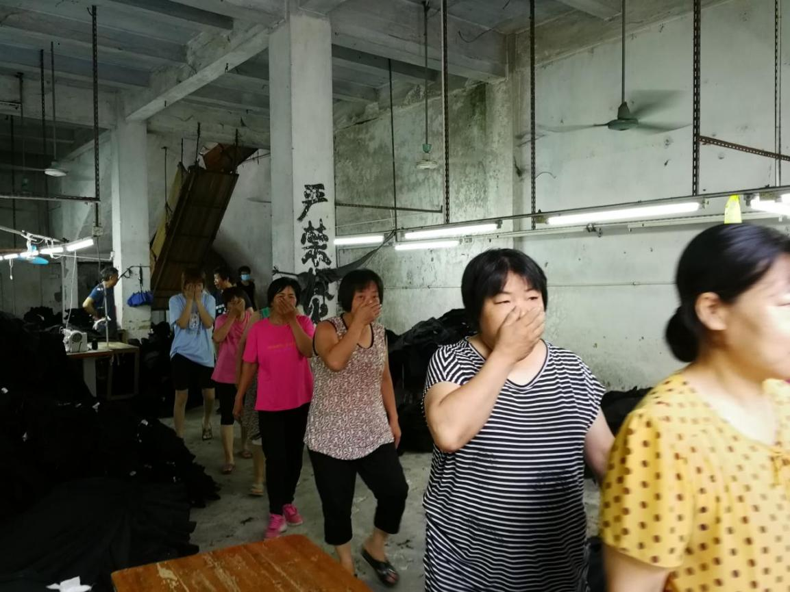 應(yīng)急演練活動分為模擬發(fā)生火災(zāi)的疏散演練和火災(zāi)初期滅火演練。隨著警報響起,參與演練的制衣廠員工和蜆岡墟居民低頭彎腰,捂住口鼻,從安全出口迅速撤離現(xiàn)場并至安全點集合。
