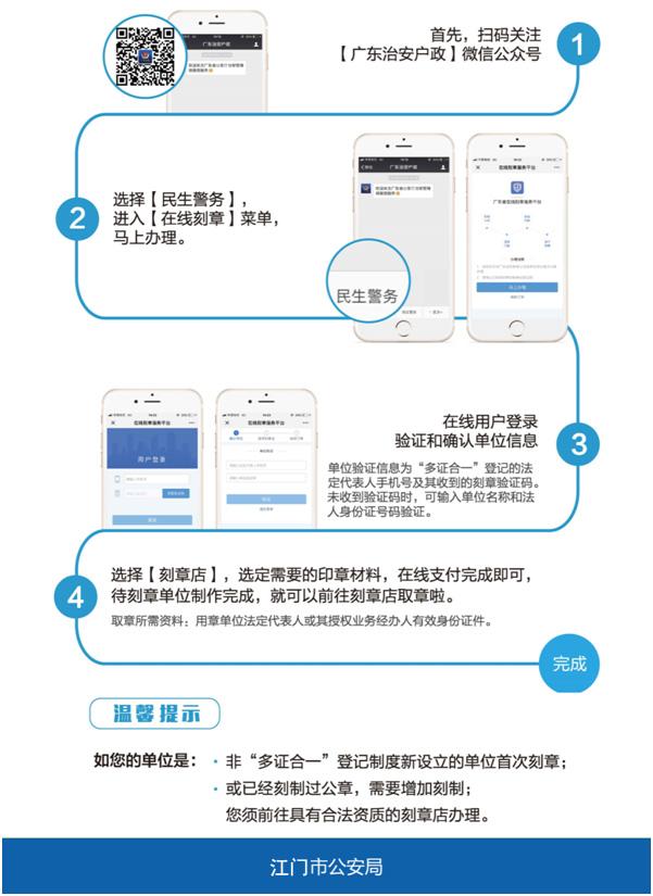 2018年,廣東省公安廳在全省推廣使用廣東省公章治安管理信息系統,創新推出了手機端在線刻章便民服務。江門市全面推進“互聯網+公章”服務與監管新模式,并于2018年10月1日正式上線廣東省公章治安管理信息系統。10月20日全市范圍內全面取消非芯片公章備案,新制作及因磨損、丟失等需要重新更換的公章須統一嵌入安全芯片。