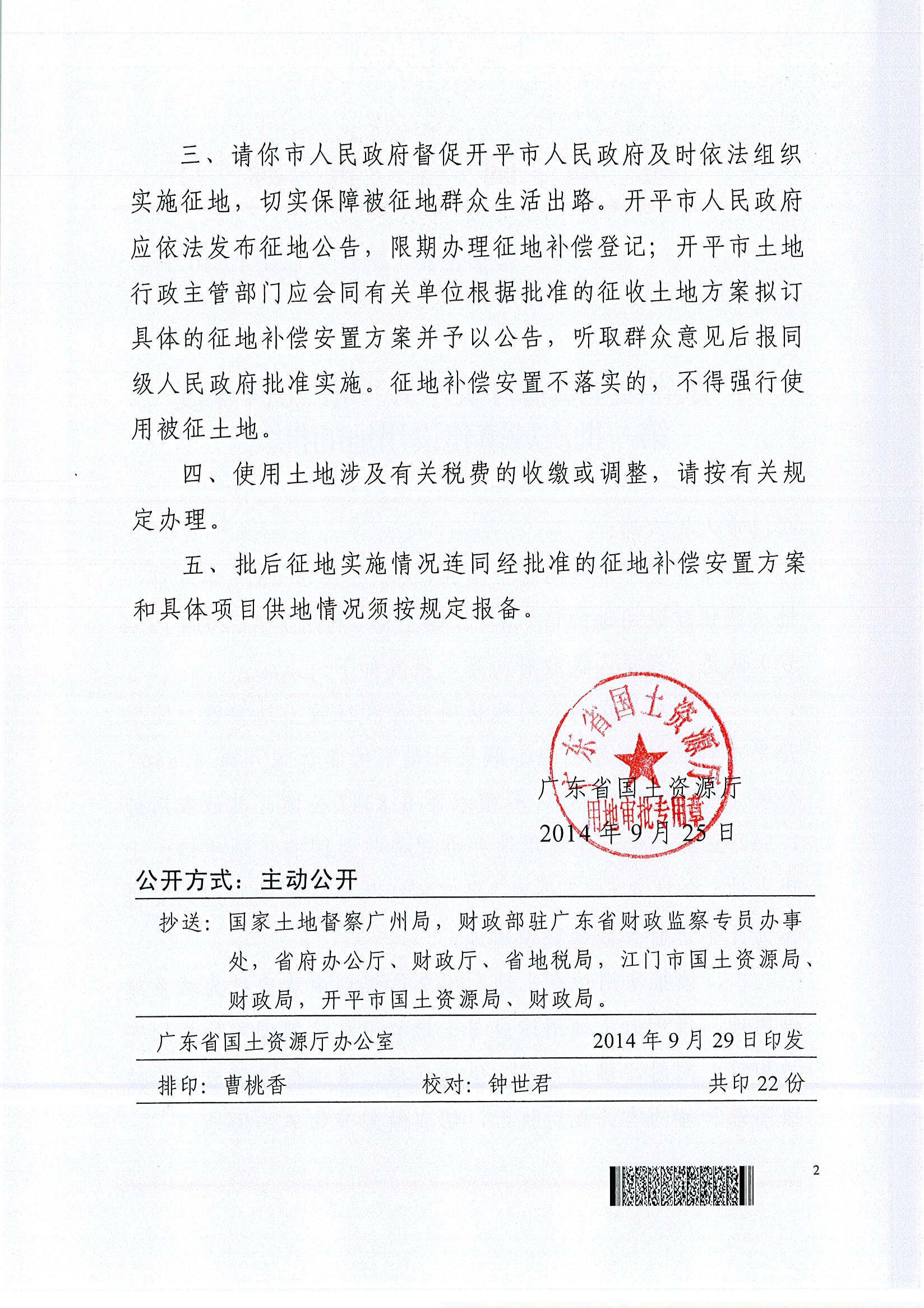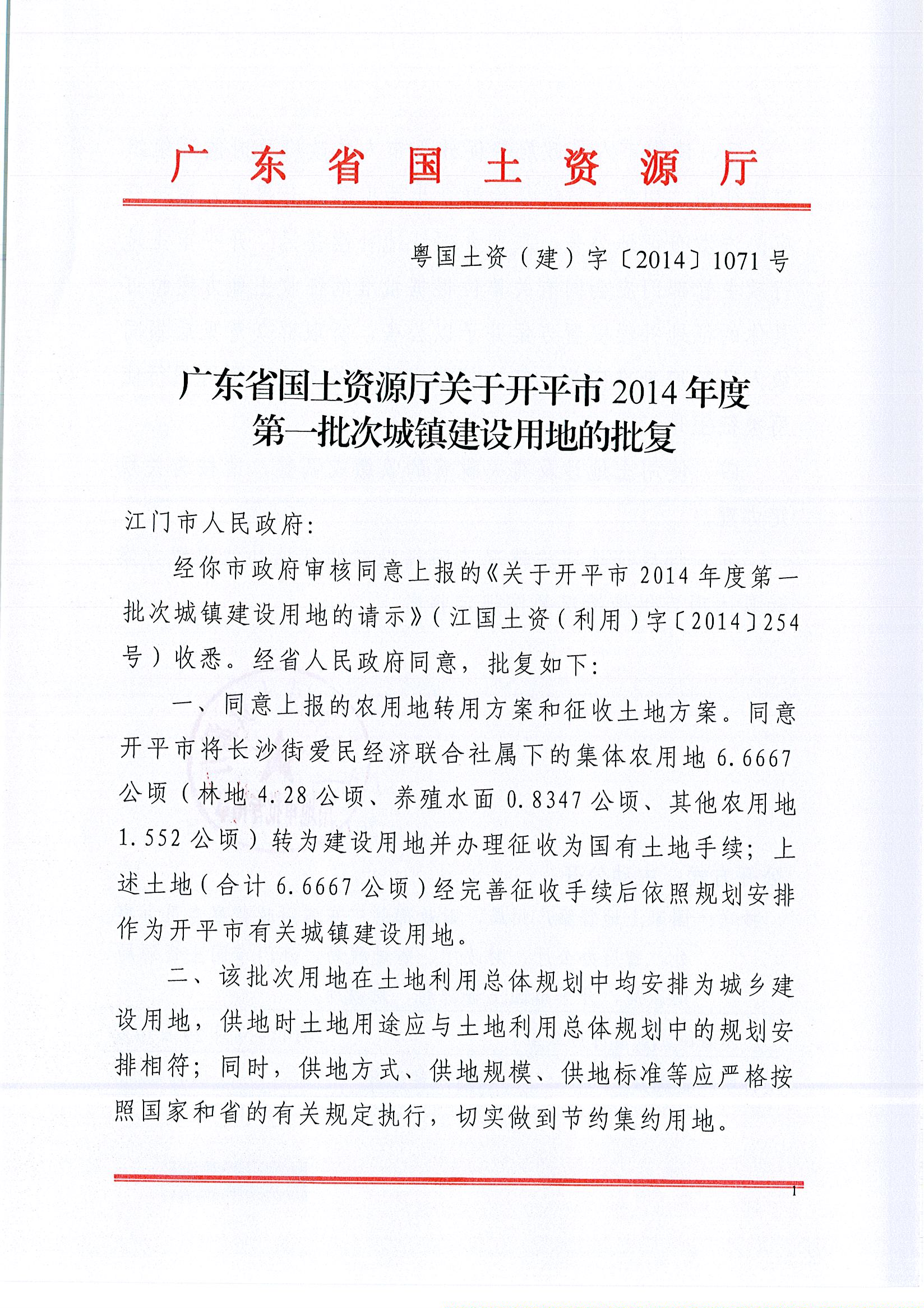 開(kāi)平市2014年度第一批次城鎮(zhèn)建設(shè)用地的批復(fù)