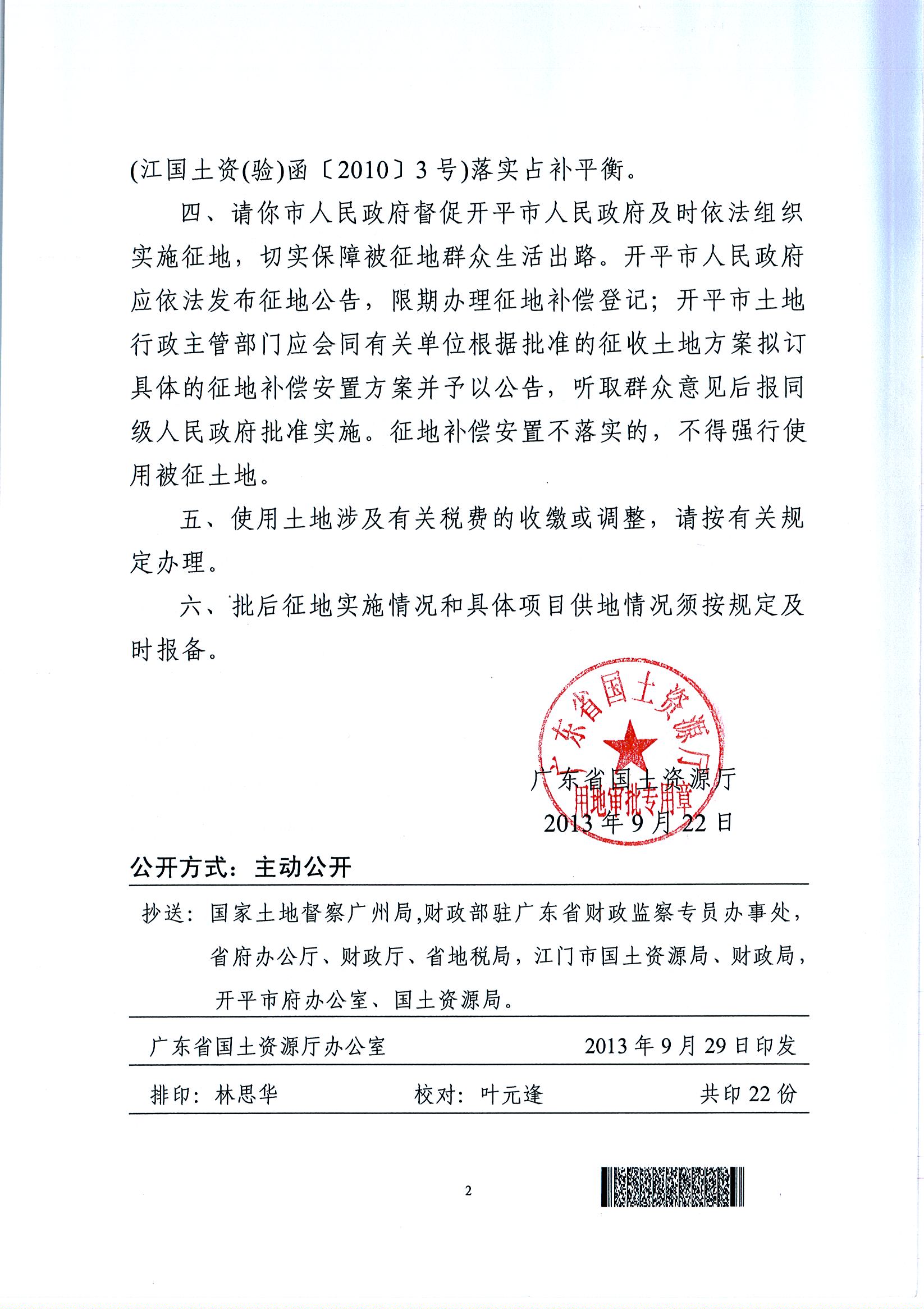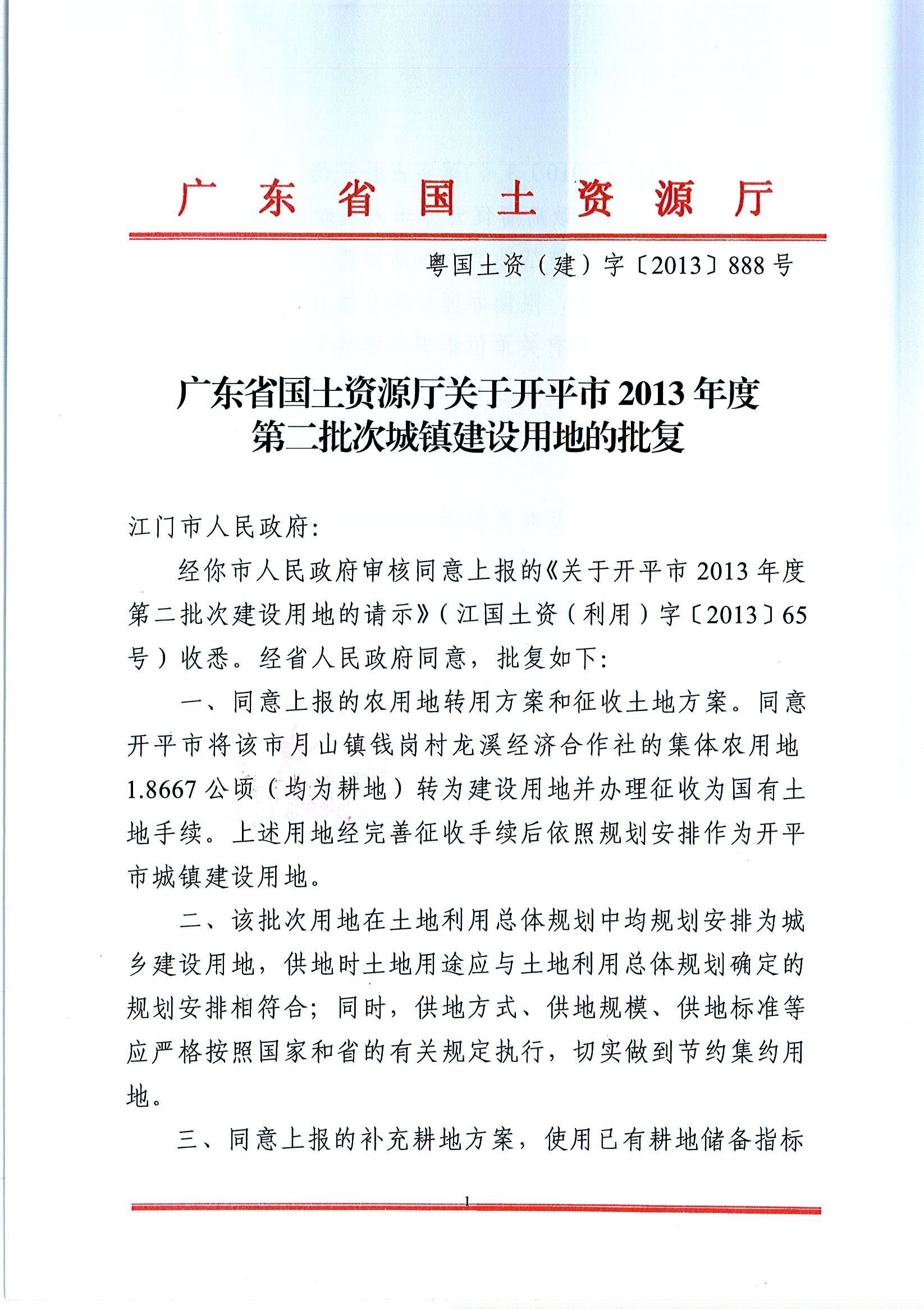 開平市2013年度第二批次城鎮(zhèn)建設(shè)用地的批復(fù)
