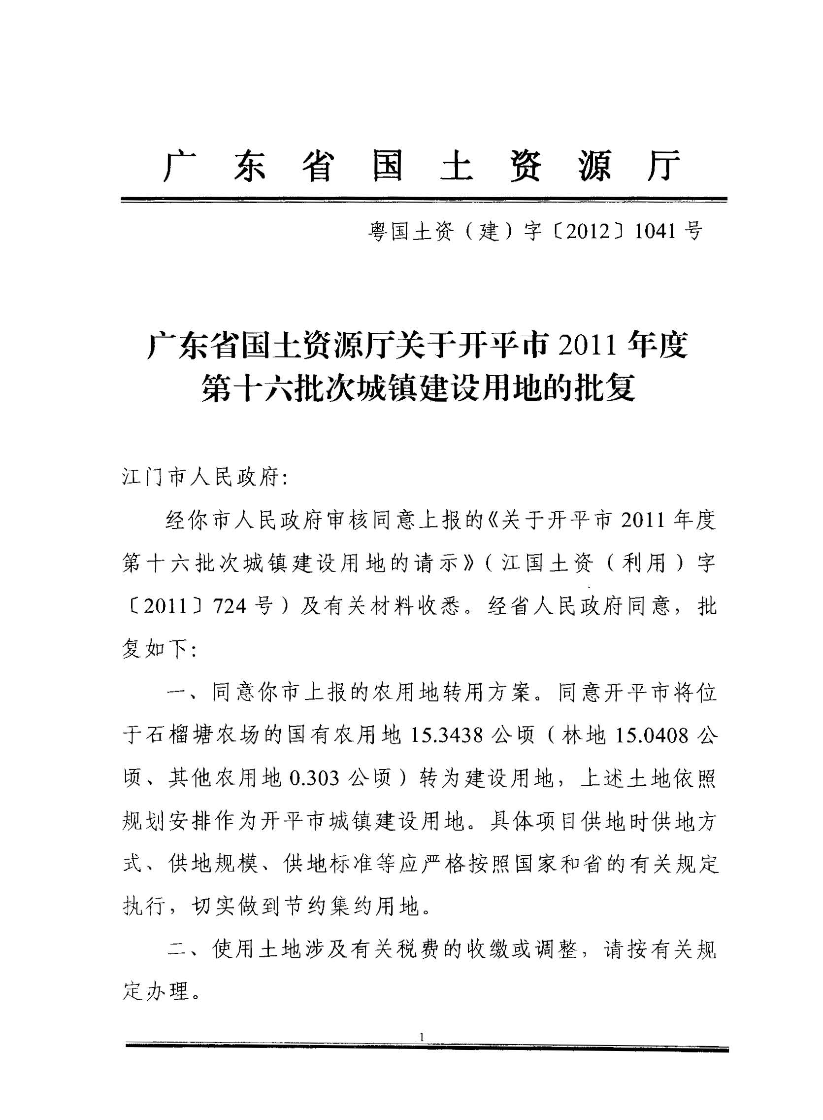 開平市2011年度第十六批次城鎮建設用地的批復
