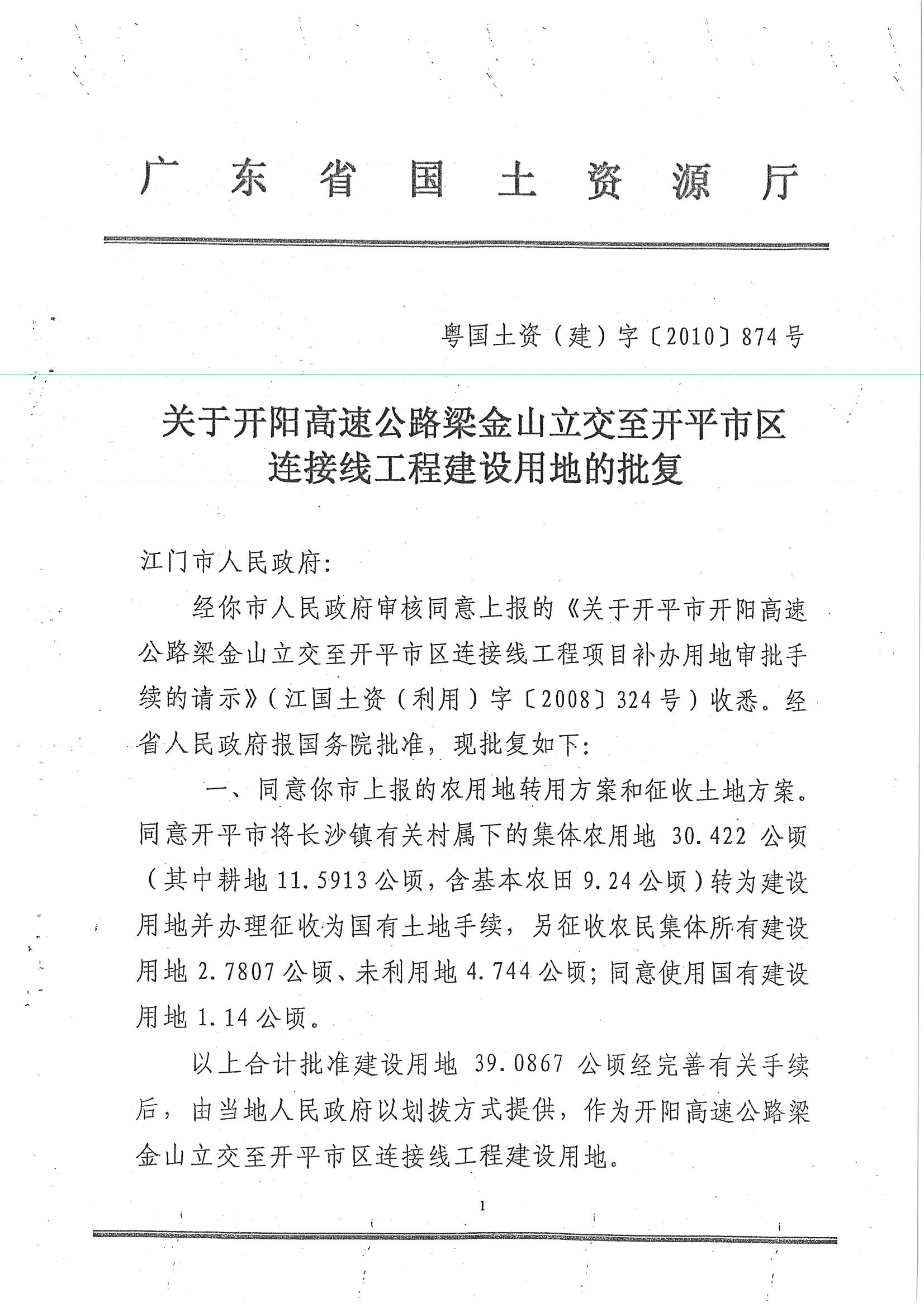 開陽高速公路梁金山立交至開平市區連接線工程建設用地的批復