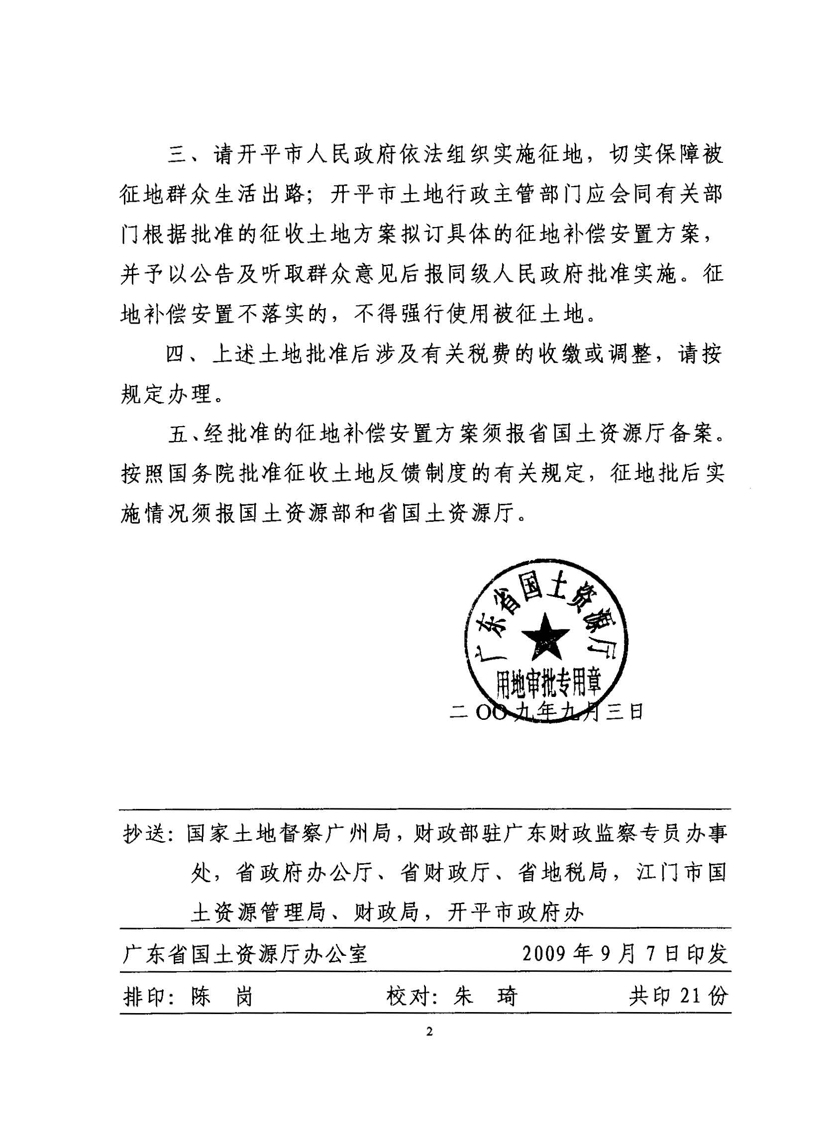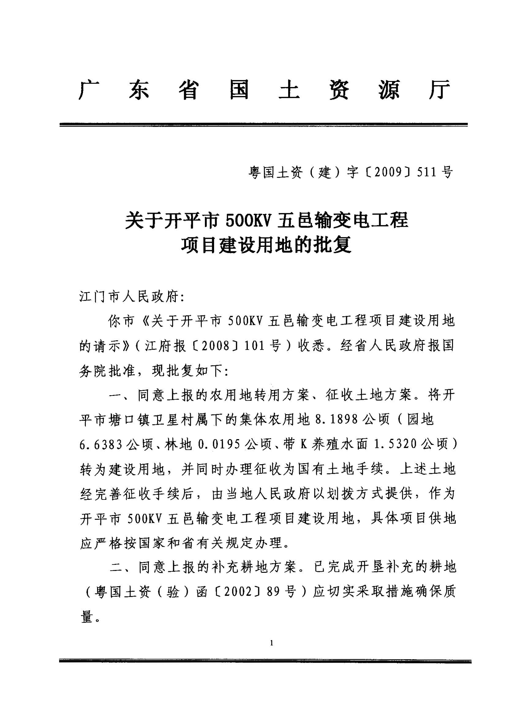 開(kāi)平市500KV五邑輸變電工程項(xiàng)目建設(shè)用地的批復(fù)