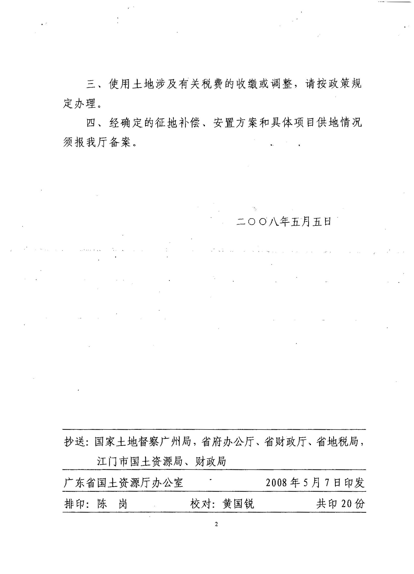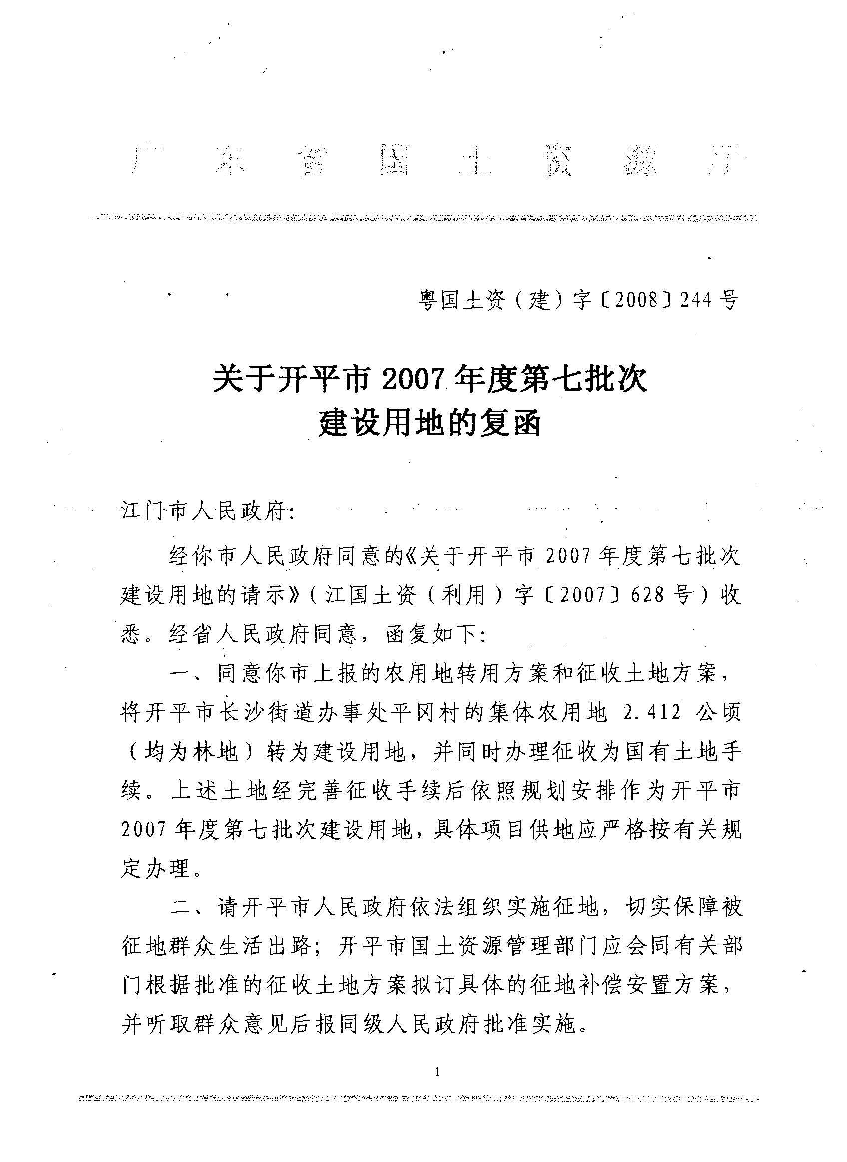 開(kāi)平市2007年度第七批次建設(shè)用地的復(fù)函