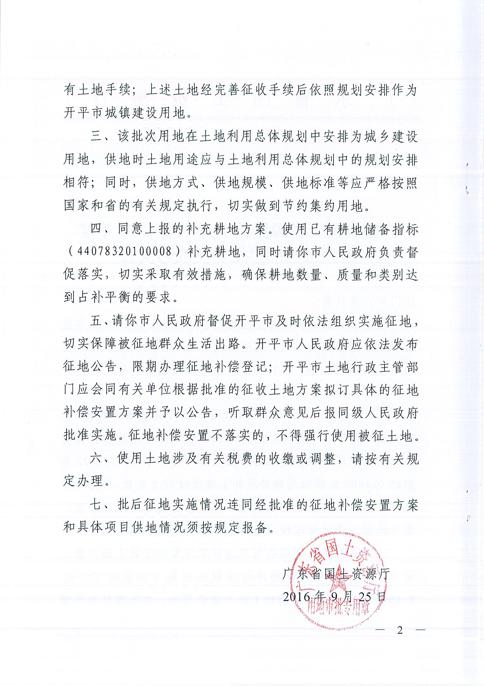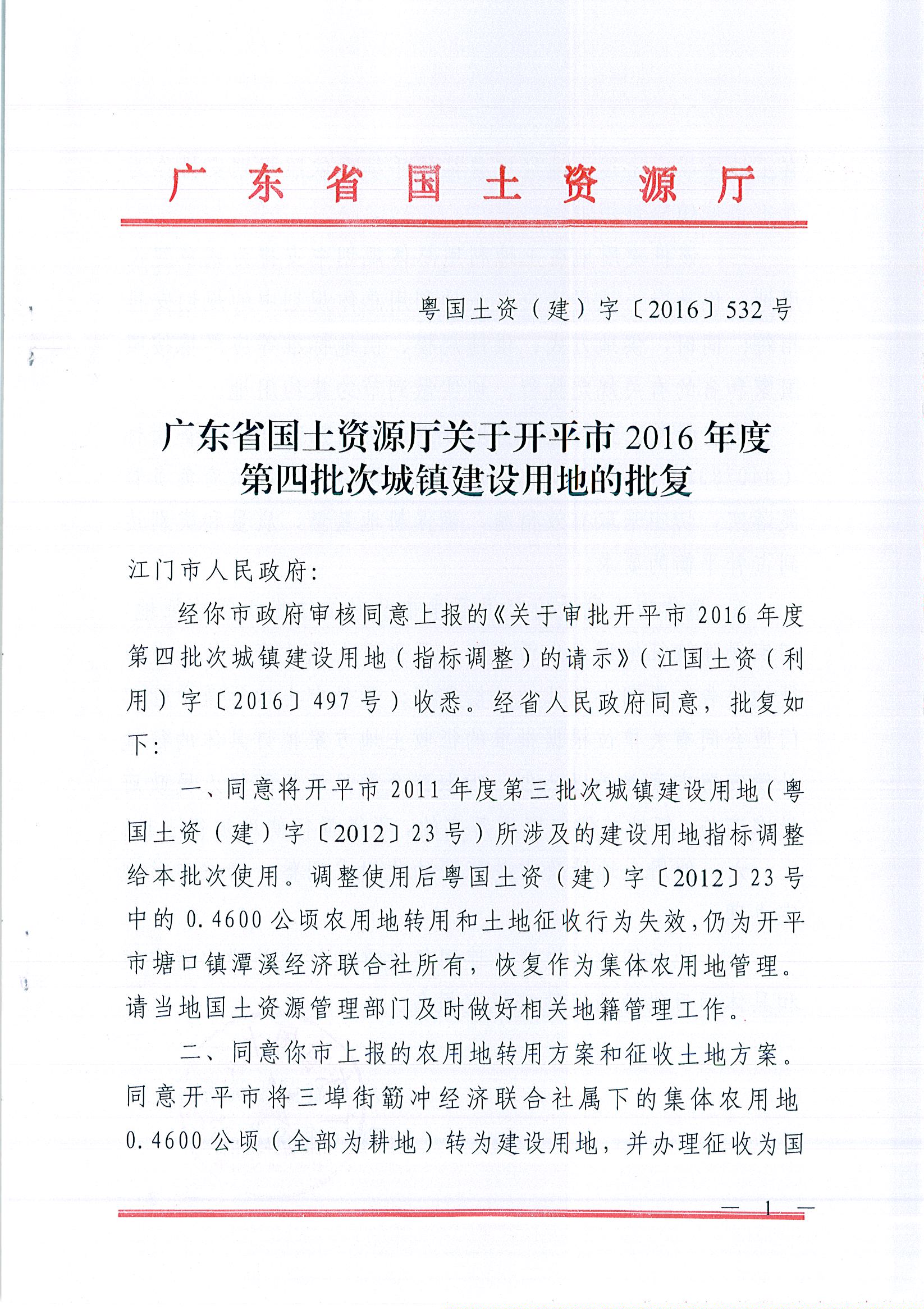廣東省國(guó)土資源廳關(guān)于開(kāi)平市2016年度第四批次城鎮(zhèn)建設(shè)用地的批復(fù)