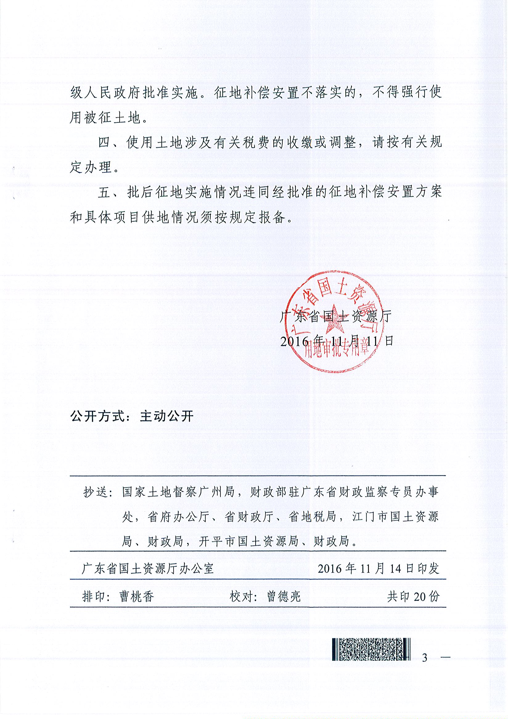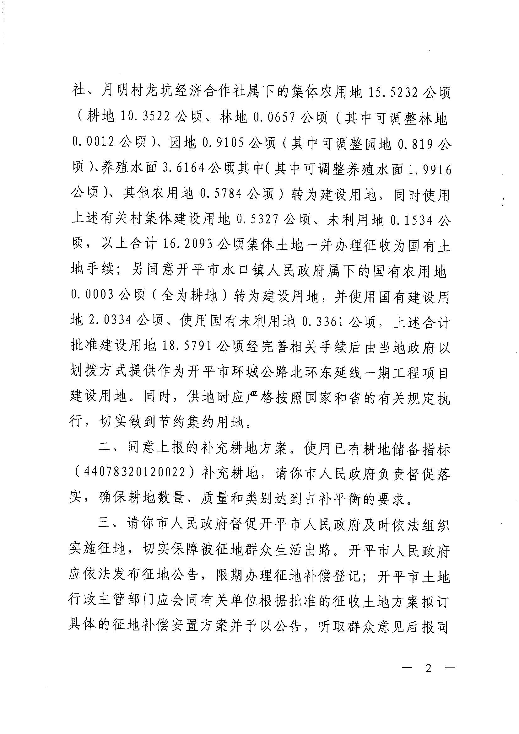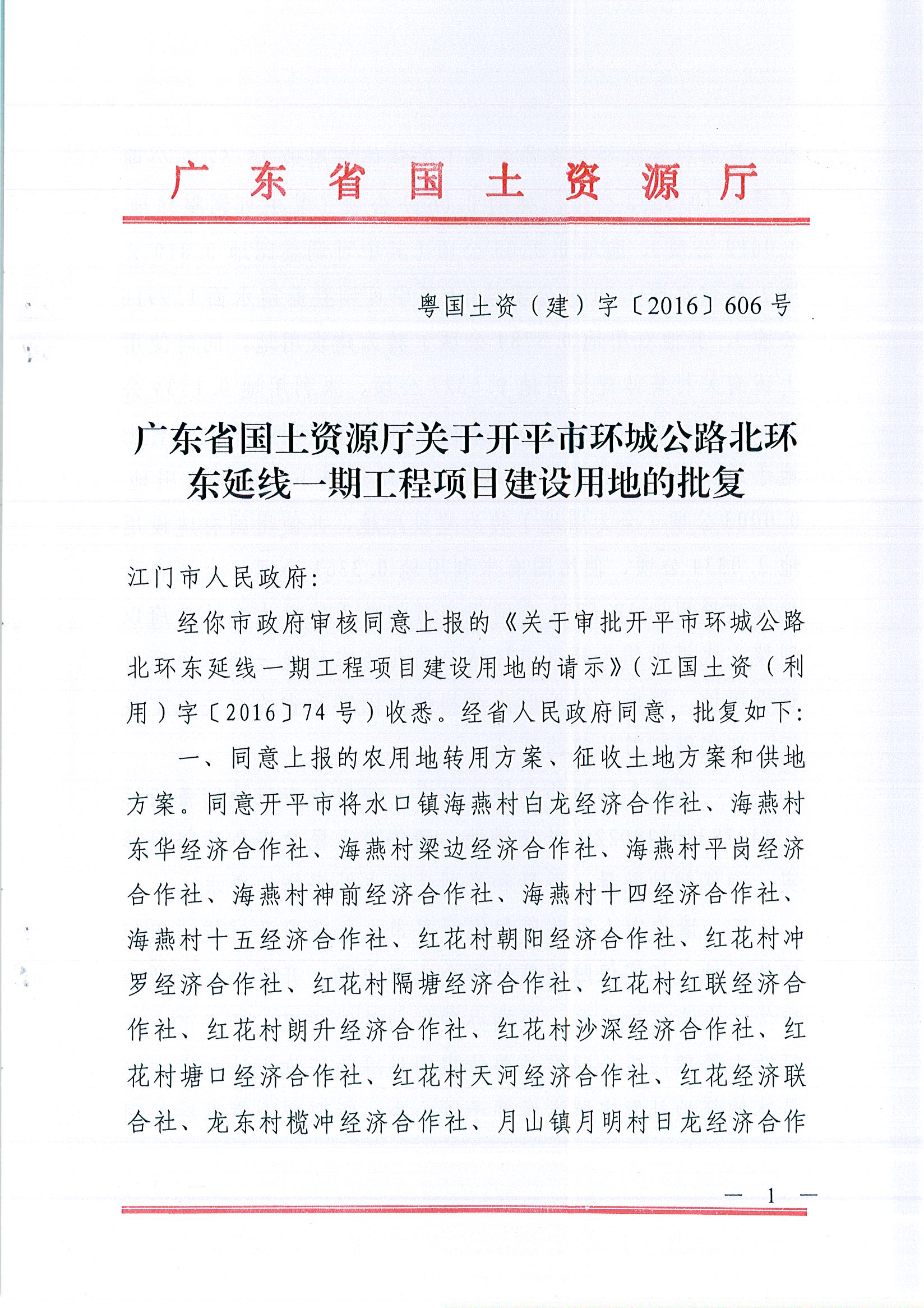 廣東省國土資源廳關于開平市環城公路北環東延線一期工程項目建設用地的批復
