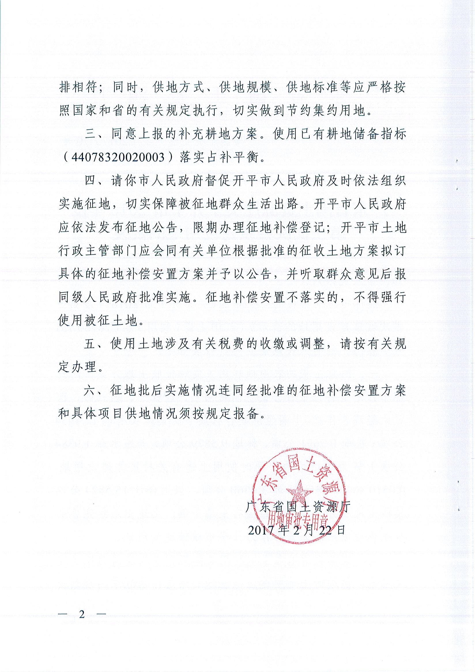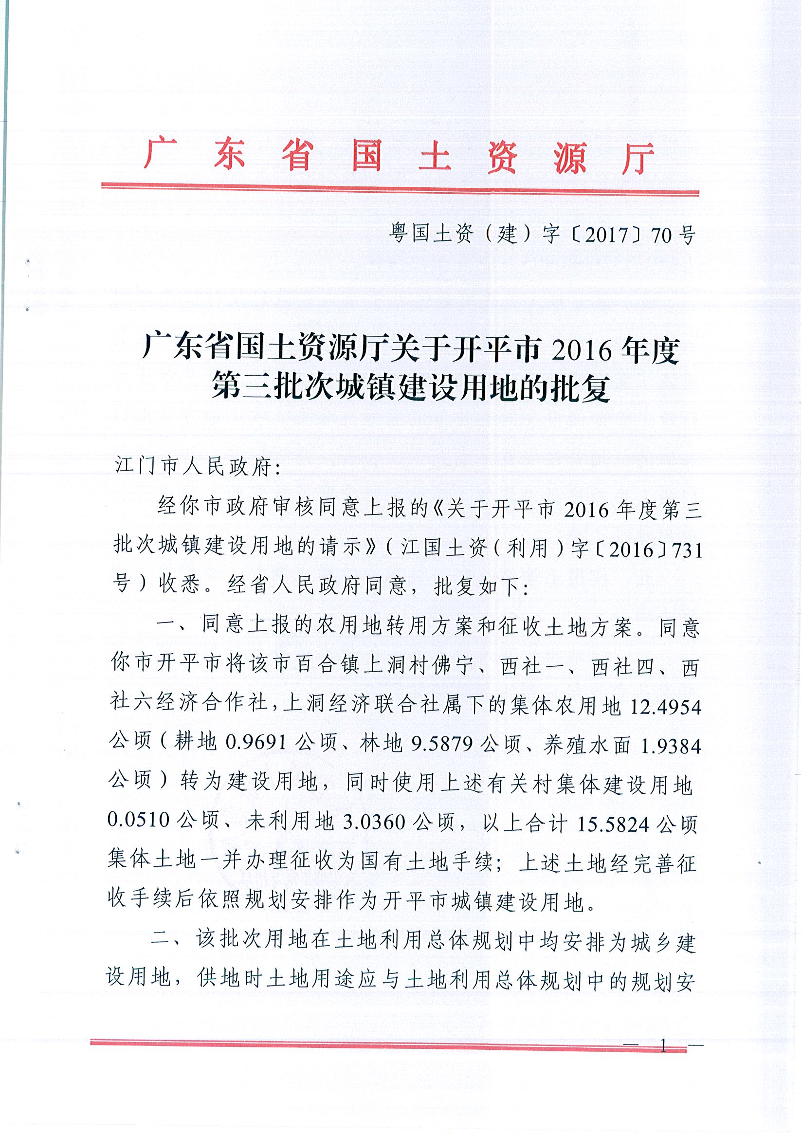 廣東省國土資源廳關于開平市2016年度第三批次城鎮(zhèn)建設用地的批復