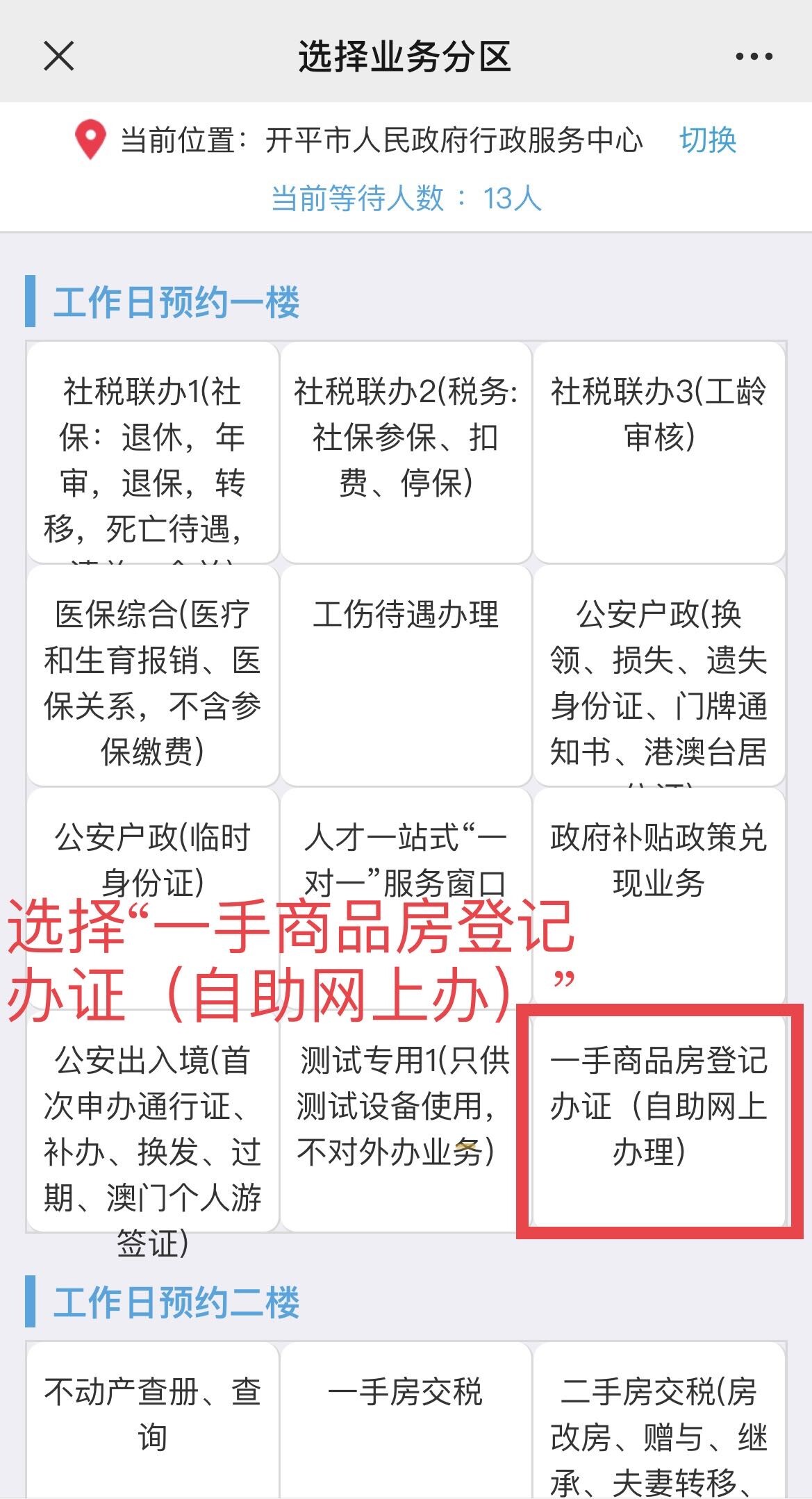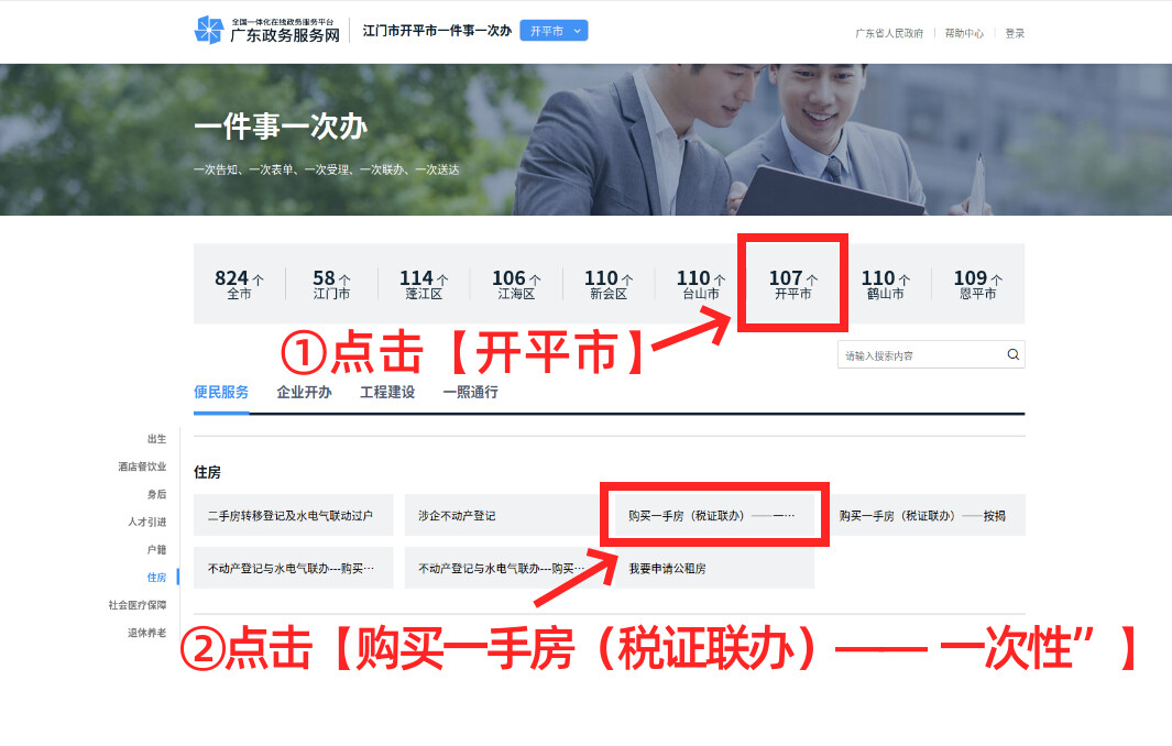 第三步:先選擇【開平市】,再從“便民服務”中找到【購買一手房(稅證聯辦)——一次性”】,點擊進入(更換圖片)