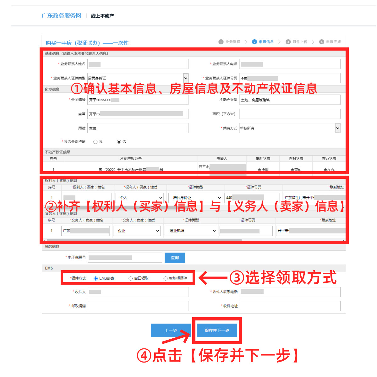 第七步:確認基本信息、房屋信息及不動產權證信息并補齊【權利人(買家)信息】與【義務人(賣家)信息】,選擇領取方式,確認無誤后點擊【保存并下一步】(更換圖片)