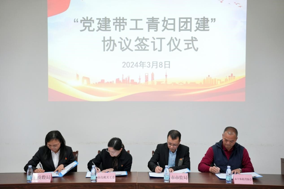 為打好黨建引領“組合拳”,奏響黨工作“立體聲”,充分發揮政企優勢互補作用,提高基層黨建工作和中心工作成效,38日下午,開平市直機關工委、市政數局、市監局、市個體私營企業協會舉行簽約儀式,共同簽署《黨建帶工青婦團建活動協議書》。