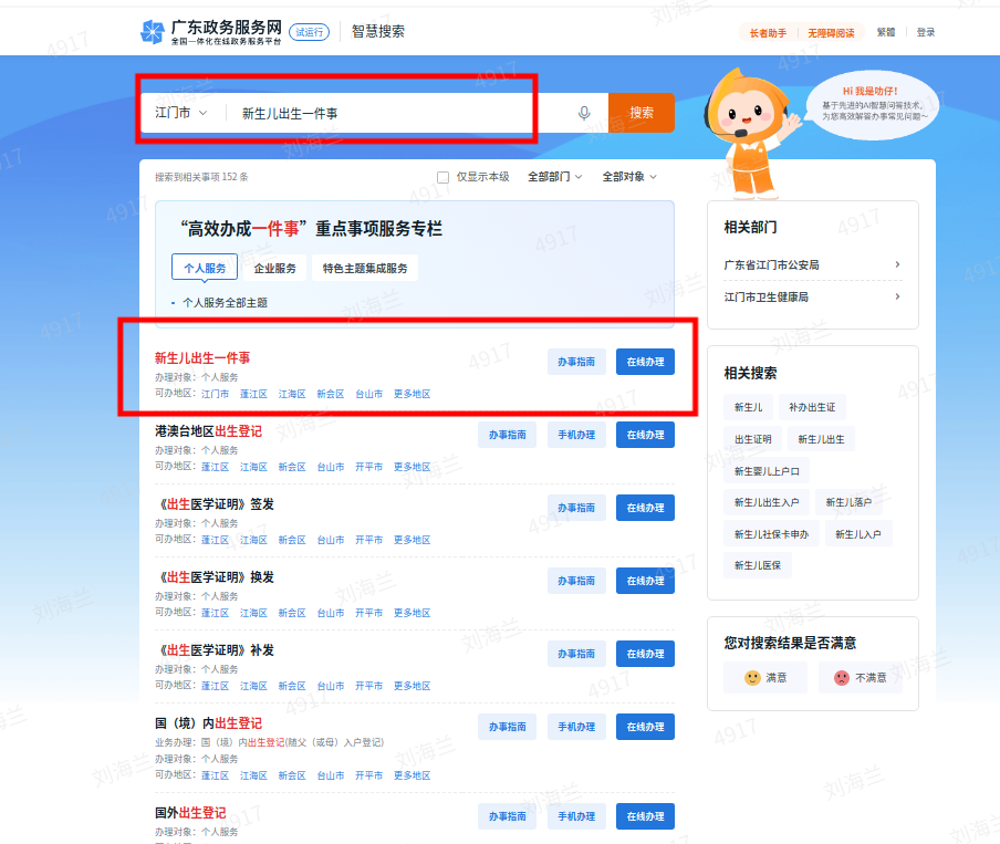 登錄廣東政務服務網,切換到江門市(https://www.gdzwfw.gov.cn/?region=440700),輸入一件事主題名稱,點擊搜索,或在特色創新模塊點擊【高效辦成一件事】,選擇“開平市”對應需要辦理的一件事服務,按流程在線操作即可完成辦理。