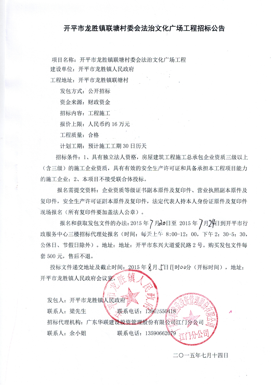 開平市龍勝鎮聯塘村委會法治文化廣場工程招標公告