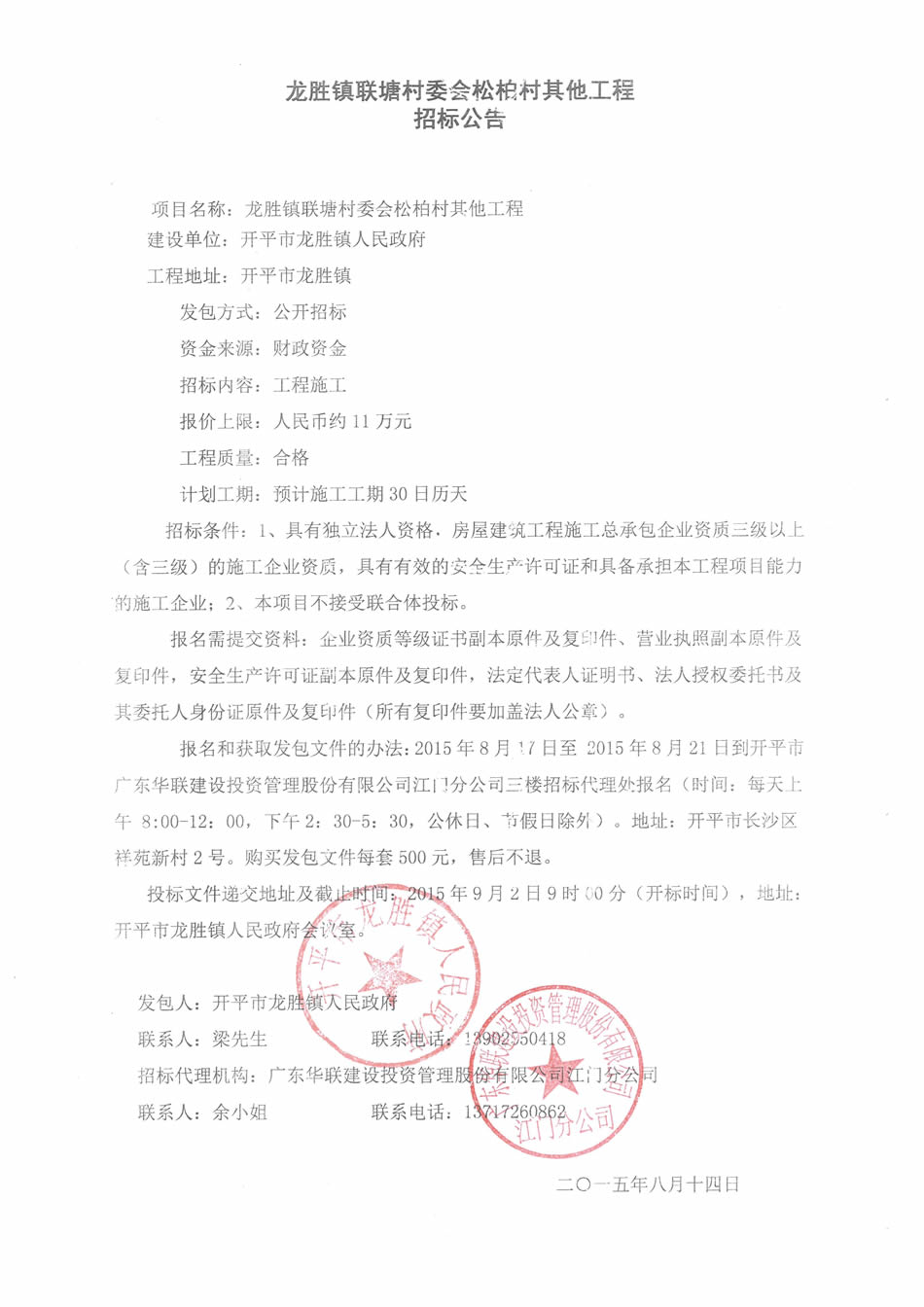 龍勝鎮聯塘村委會松柏村其他工程招標公告