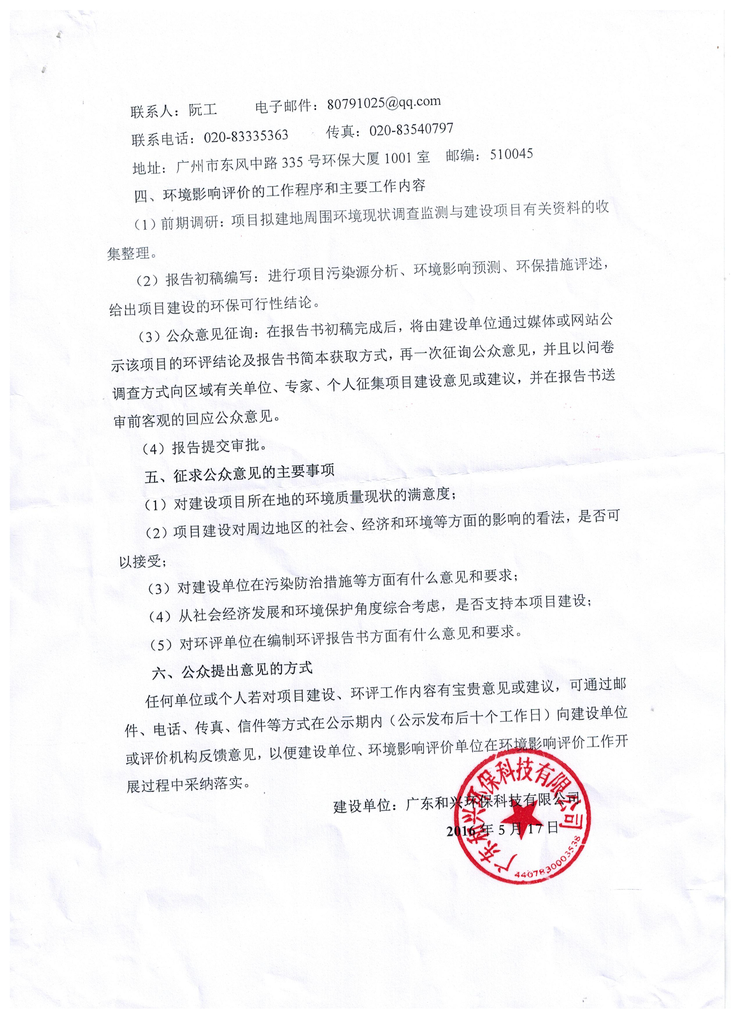 廣東和興環保科技有限公司日處理600噸污泥項目環境影響評價第一次公示