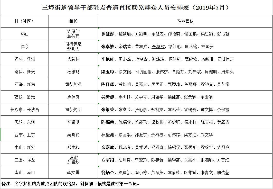 三埠街道領(lǐng)導(dǎo)干部駐點(diǎn)普遍直接聯(lián)系群眾人員安排表(2019年7月)