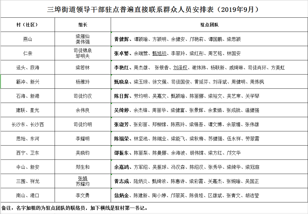 三埠街道領導干部駐點普遍直接聯系群眾人員安排表(2019年9月)