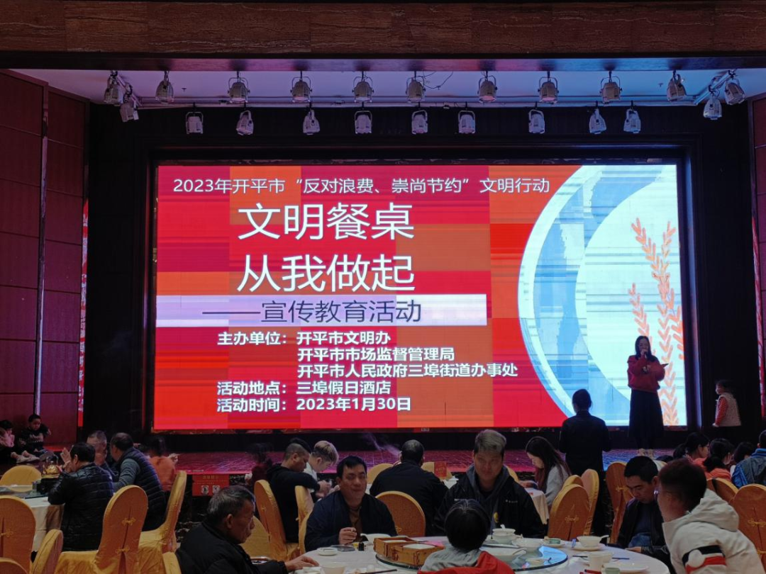 民以食為天,食以儉養德。吃飯是社會生活的重要部分,餐桌文明更是社會文明的重要體現。近期,三埠街道辦事處聯合市市場監督管理局,在假日酒店開展“文明餐桌 從我做起”宣傳教育活動,以文明節儉新風尚助力我市創文,落實反對浪費、崇尚節約文明行動。