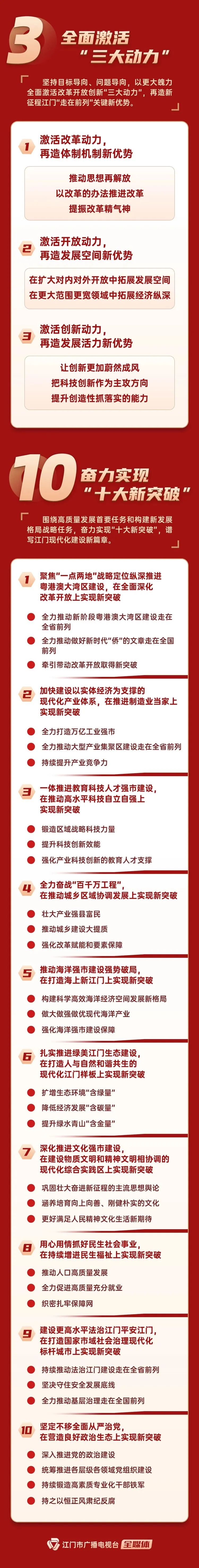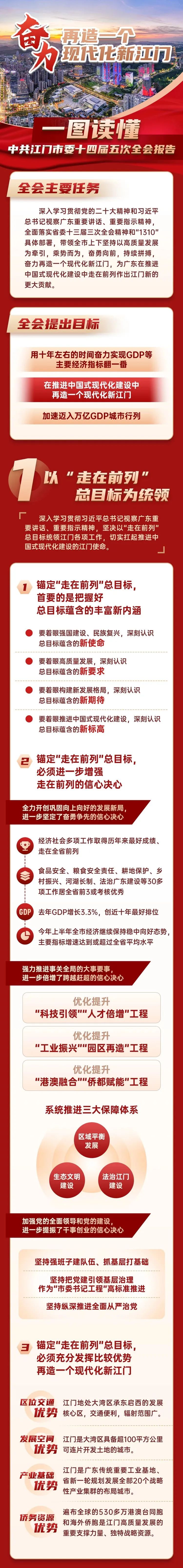 全會總結前一階段成果,把在學習貫徹中形成的思想共識、發展思路、工作舉措凝聚成為工作部署,進一步動員引領全市上下堅定不移沿著習近平總書記指引的方向,振奮精神再出發、爭先進位再創業,奮力再造一個現代化新江門,為廣東在推進中國式現代化建設中走在前列作出江門新的更大貢獻。