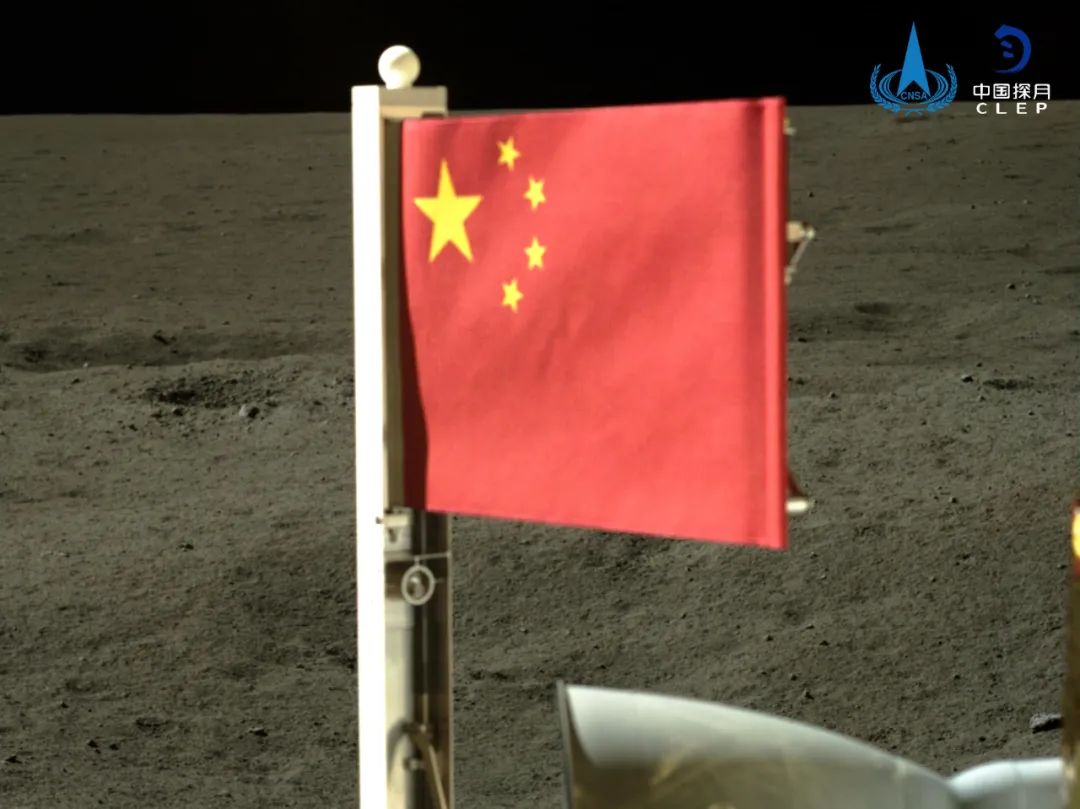 還有這鮮艷的一抹紅——表取完成后,嫦娥六號著陸器攜帶的五星紅旗在月球背面成功展開。這是我國首次在月球背面獨立動態展示國旗。